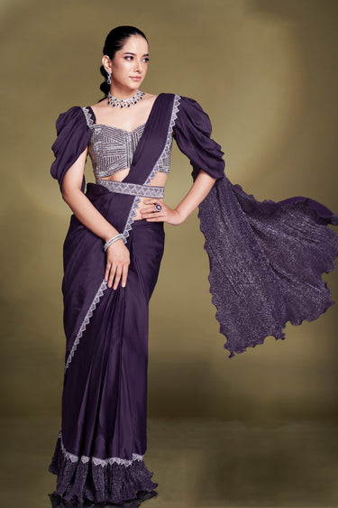 Satin Silk Ready To Wear Purple Aari Work Saree