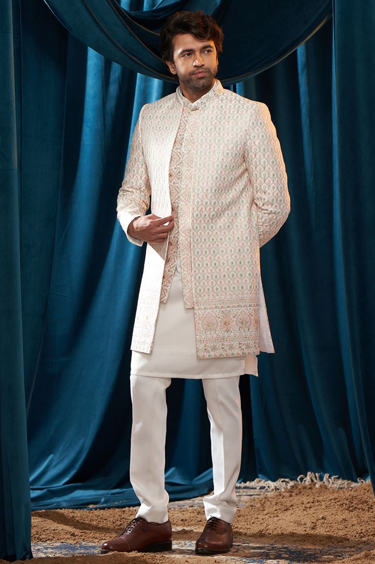 Satin White Wedding Wear Readymade Lovely Embroidered Indo Western For Men