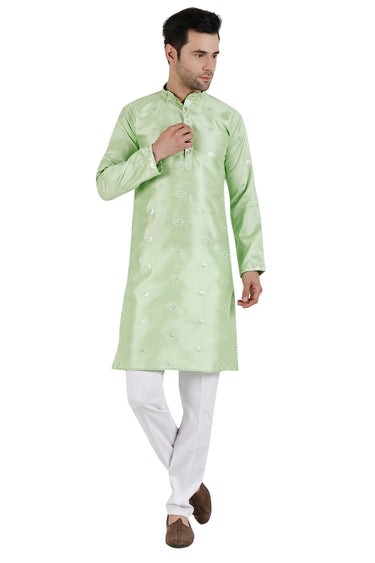 Grace your events in this stunning Art Silk Fabric Wedding Wear Kurta Pyjama. Expertly tailored, it comes ready-made, making it a stress-free yet fashionable choice. Designed in radiant hues and elaborate motifs, it adds an aura of richness, enhancing your look. Wear it to weddings, receptions, or any special occasion, and stand out in a crowd!