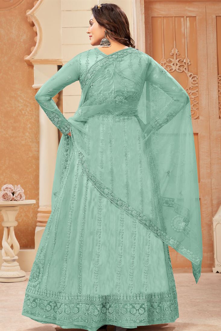 Sea Green Color Net Fabric Attractive Embroidered Anarklai Suit