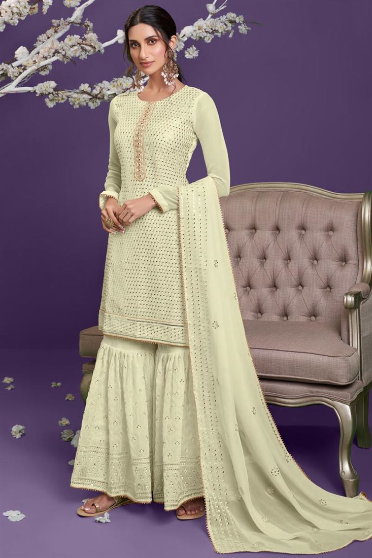 Sea Green Color Splendid Embroidered Sharara Suit In Georgette Fabric