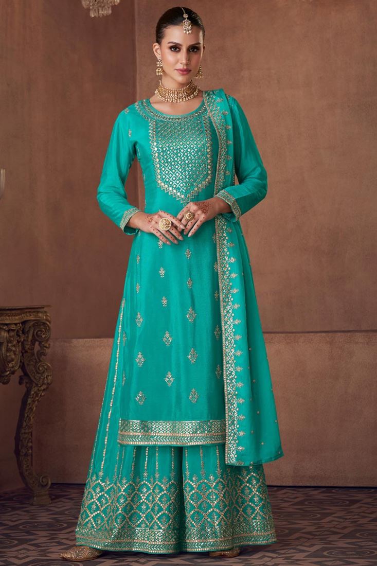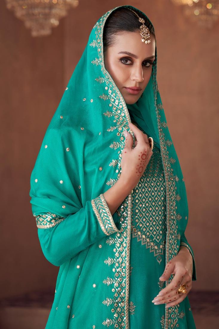 Sea Green Georgette And Chinon Embroidered Palazzo Suit In Function Wear