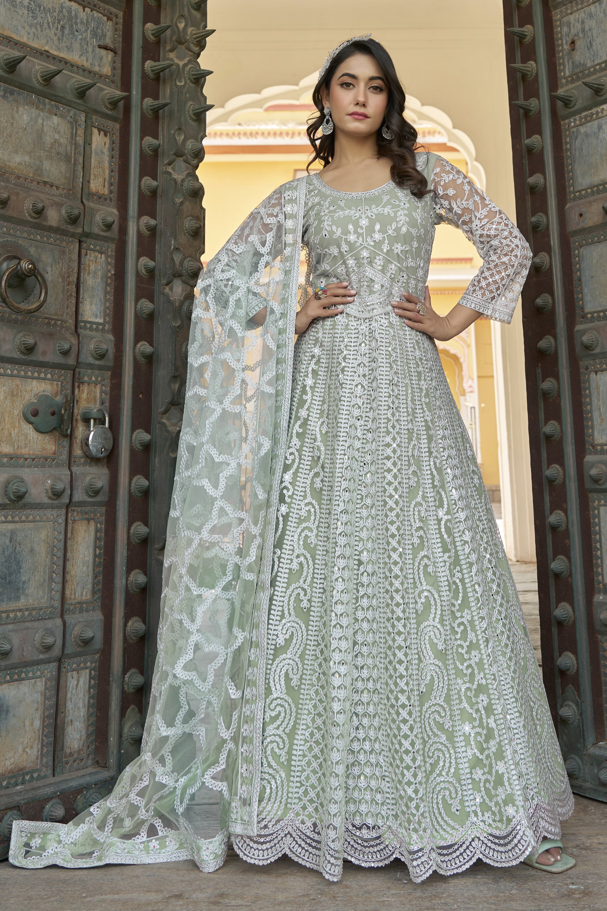 Sea Green Net Party Wear Readymade Anarkali Style Gown With Dupatta
