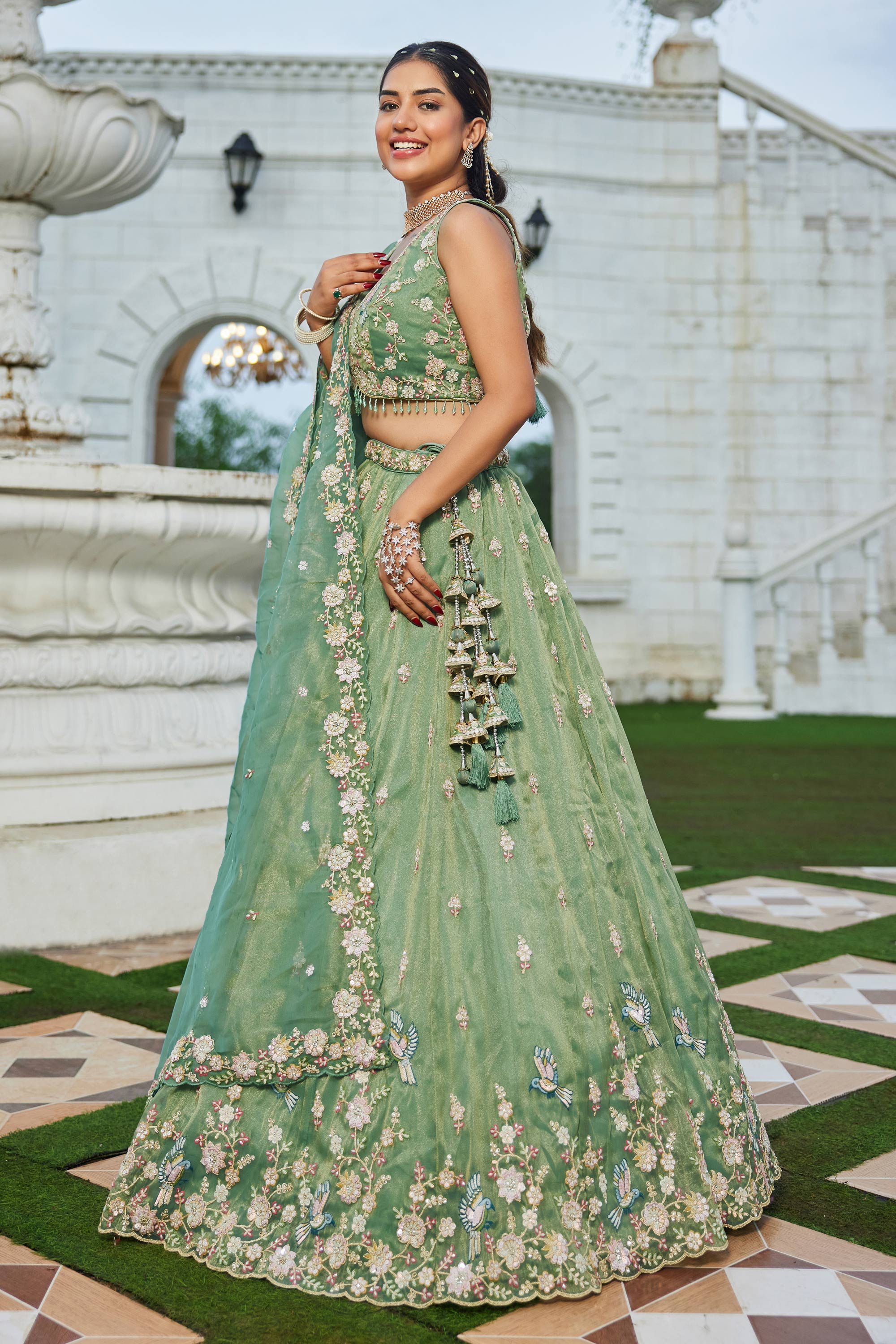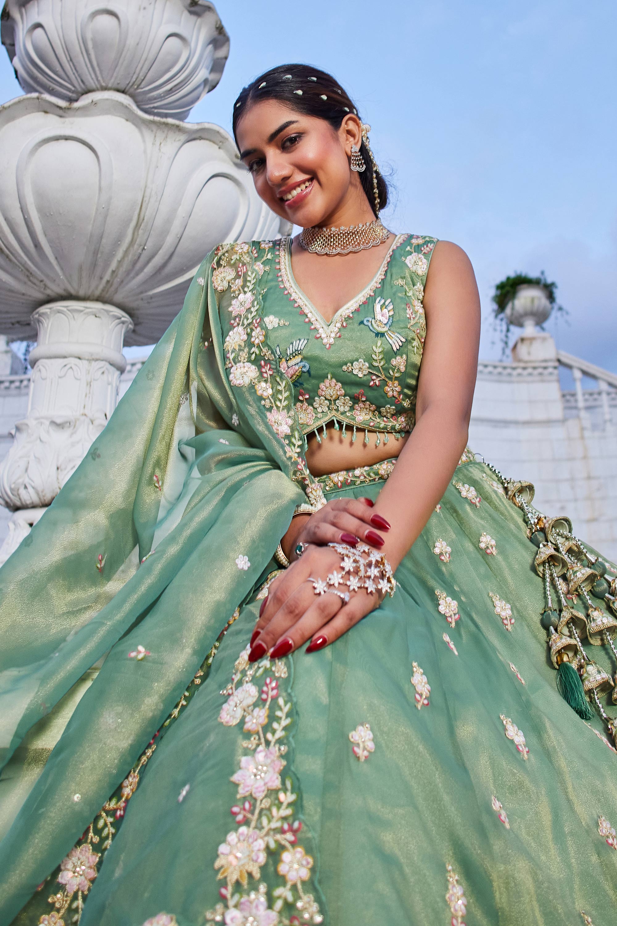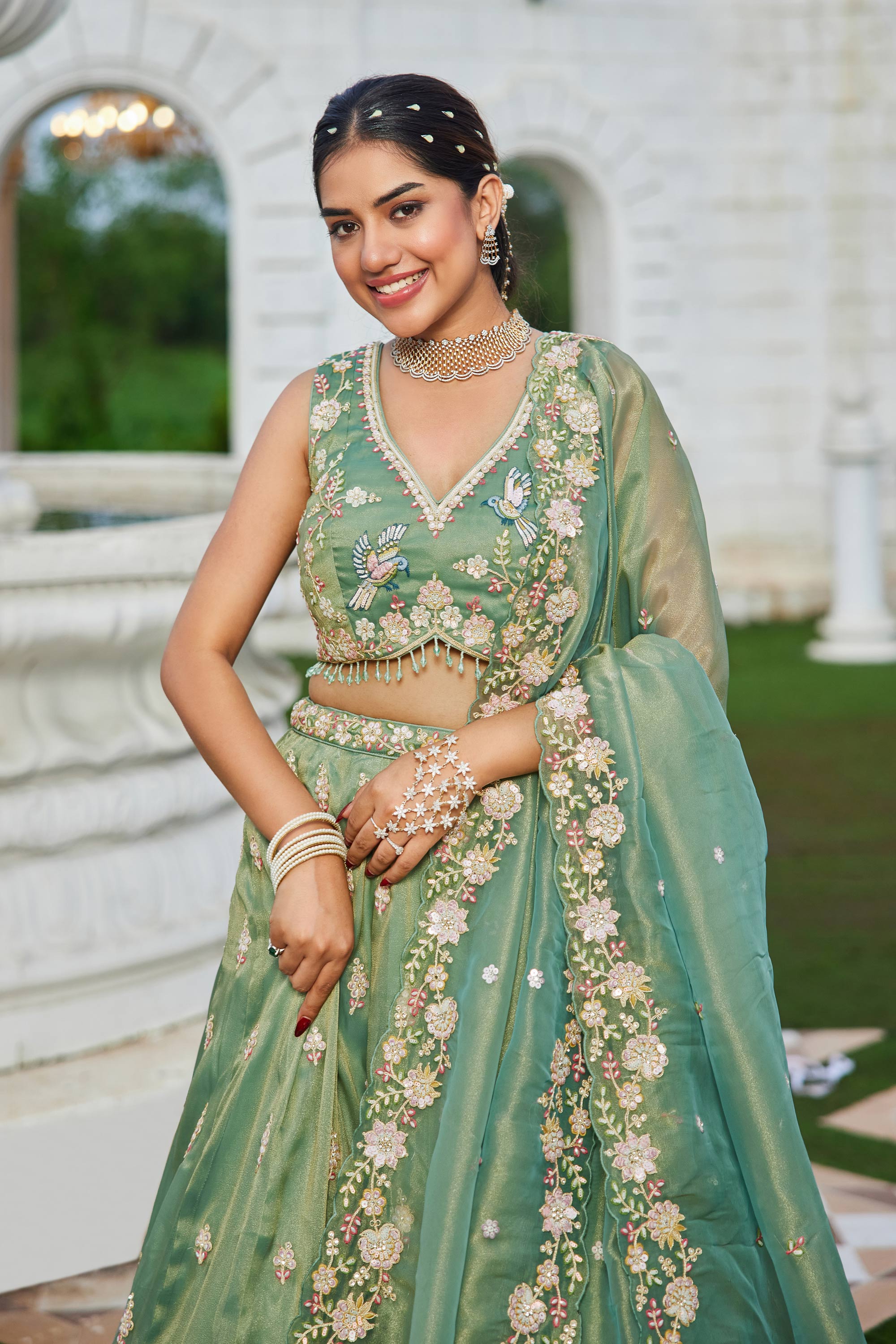 Sea Green Wedding Wear Tissue Fabric Lehenga Choli With Dupatta