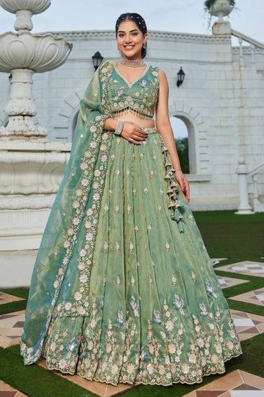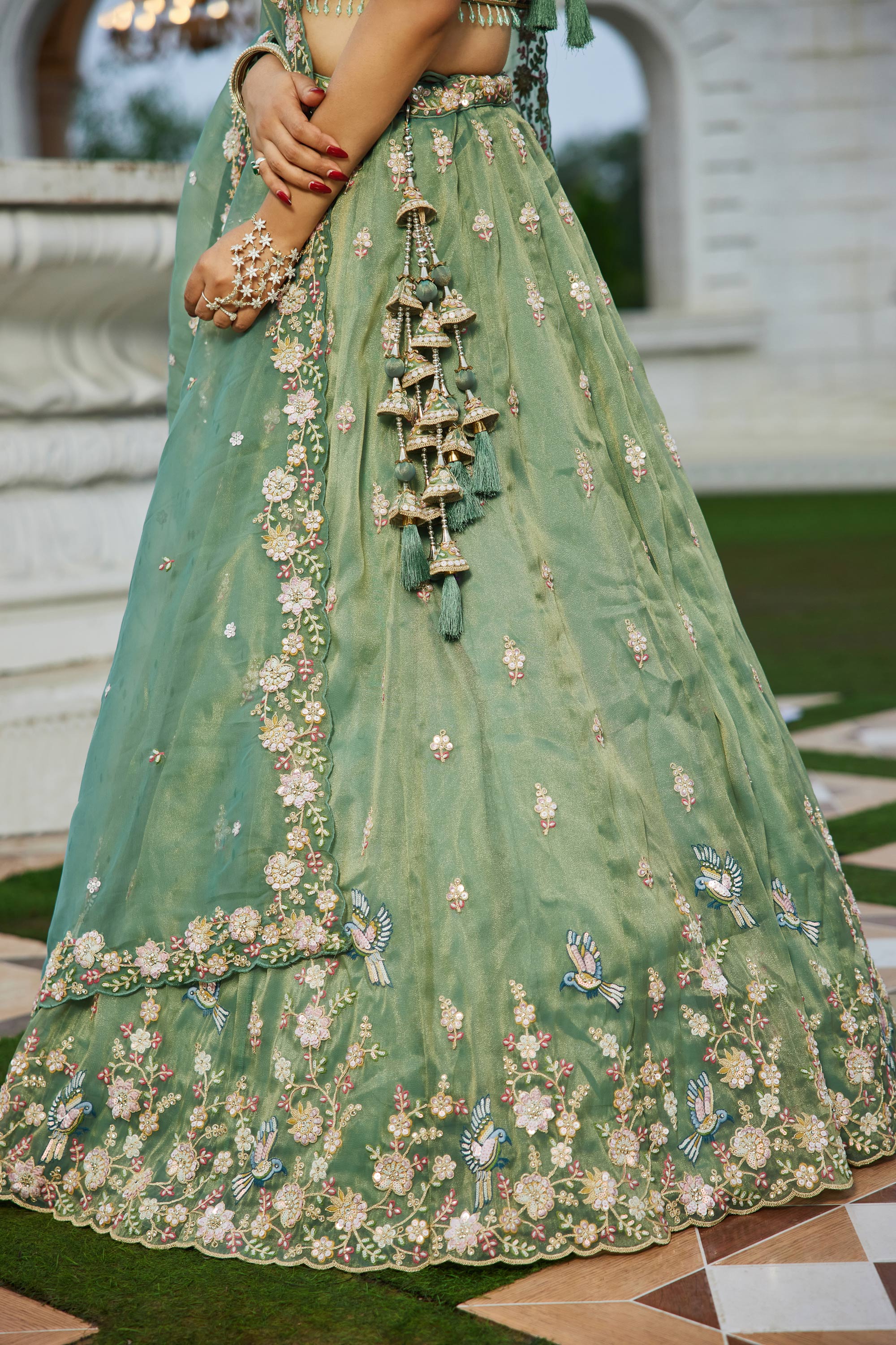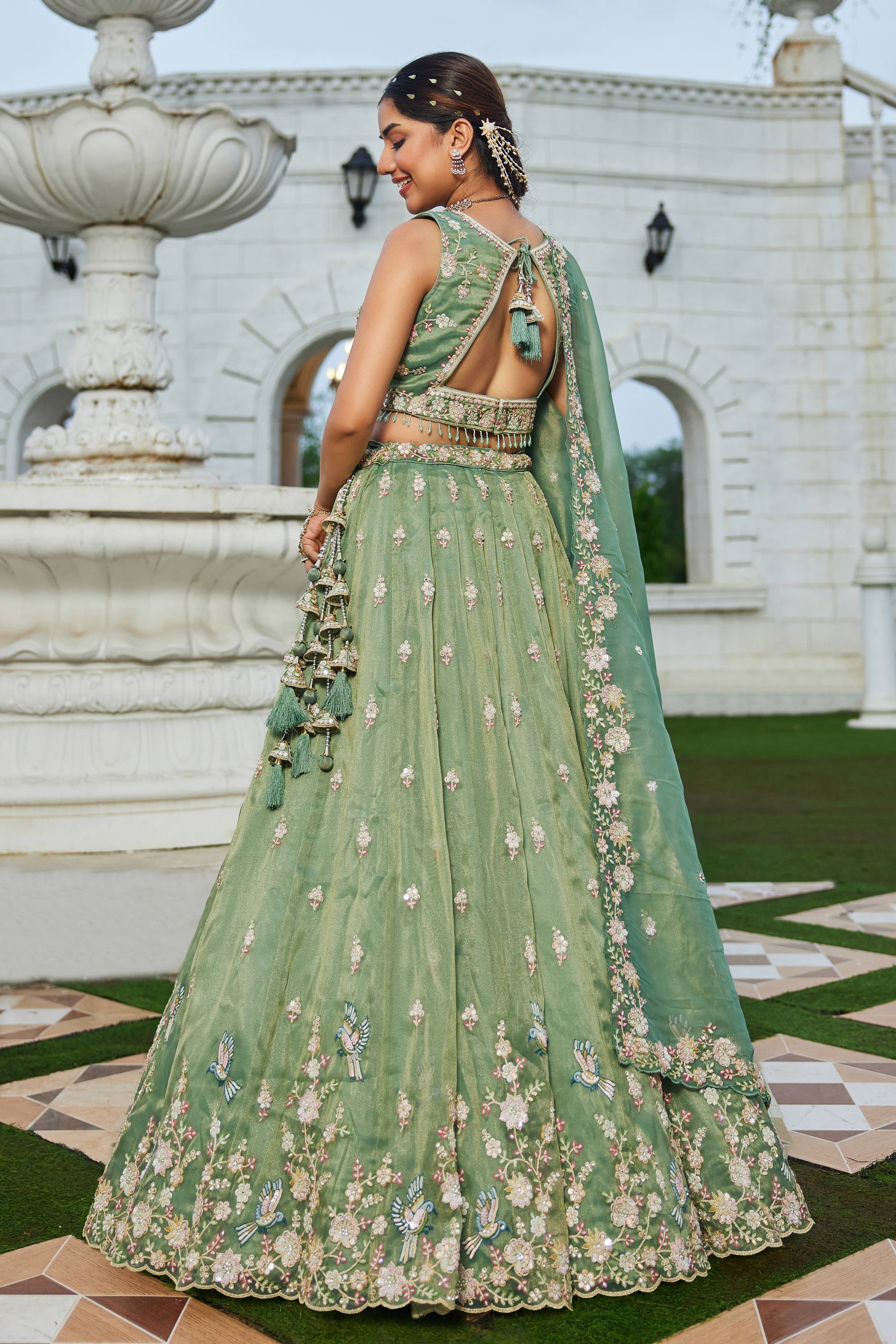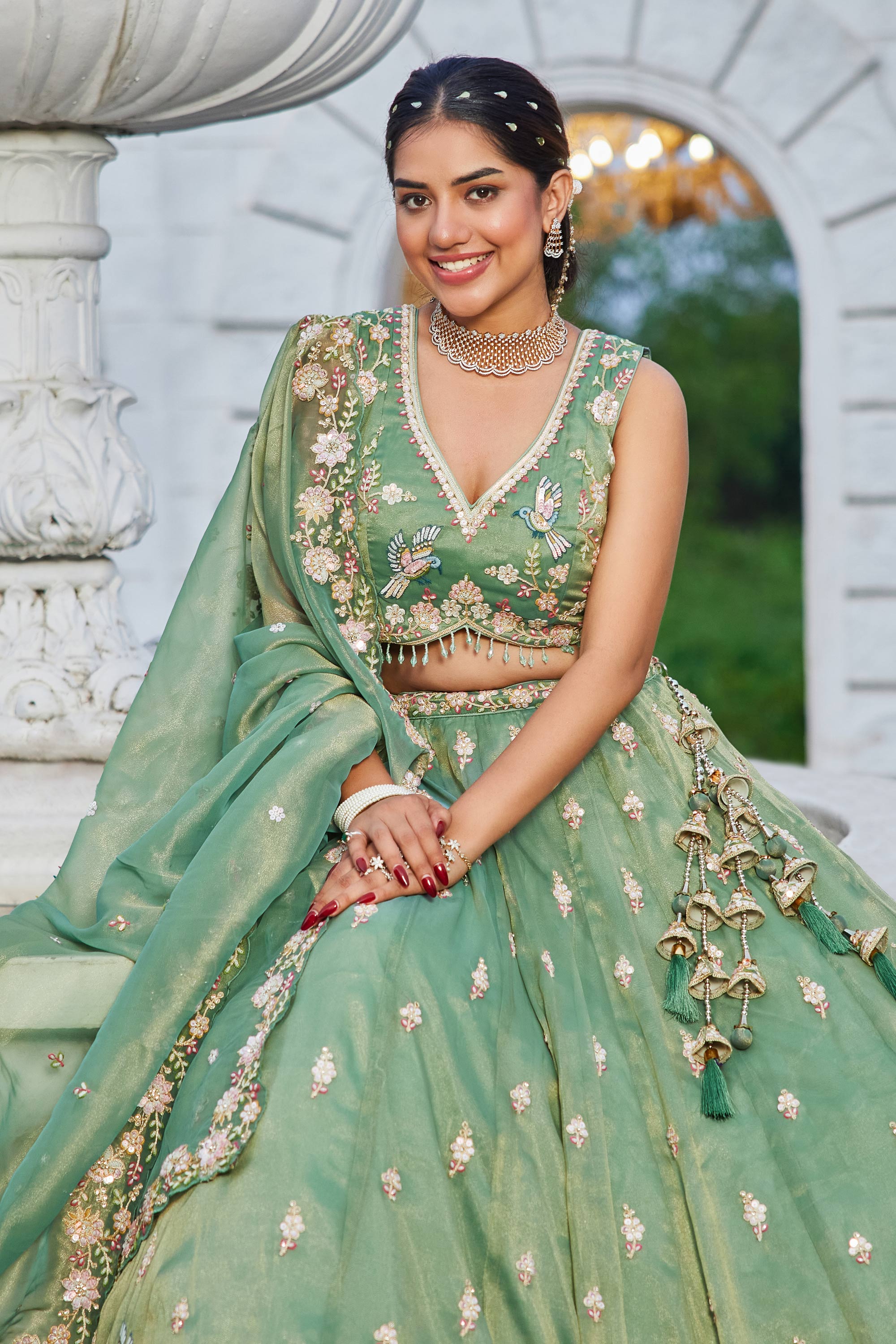 Sea Green Wedding Wear Tissue Fabric Lehenga Choli With Dupatta