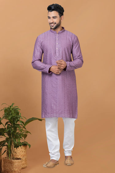 Sequins Embroidery Lavender Color Readymade Cotton Fabric Kurta Pyjama For Men