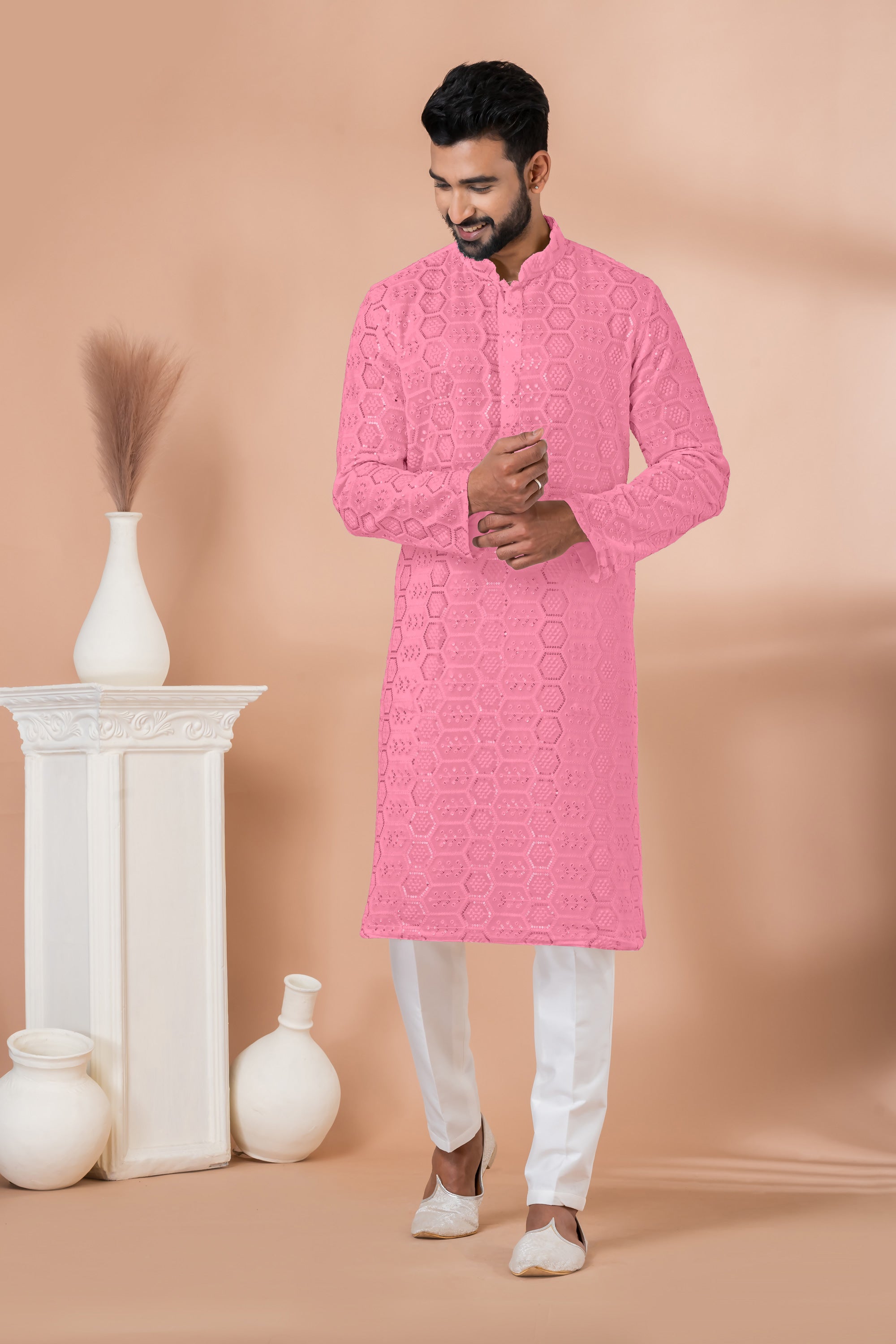 Sequins Embroidery Pink Georgette Graceful Readymade Men Kurta Pyjama For Festive Wear