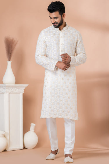 Sequins Embroidery White Color Reception Wear Readymade Georgette Fabric Kurta Pyjama For Men
