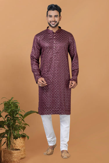 Sequins Embroidery Wine Color Gorgeous Gajji Silk Readymade Kurta Pyjama For Men