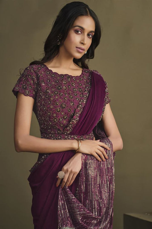 Sequins Work On Art Silk Fabric Maroon Color Lavish Ready To Wear Saree With Semi Stitched Blouse
