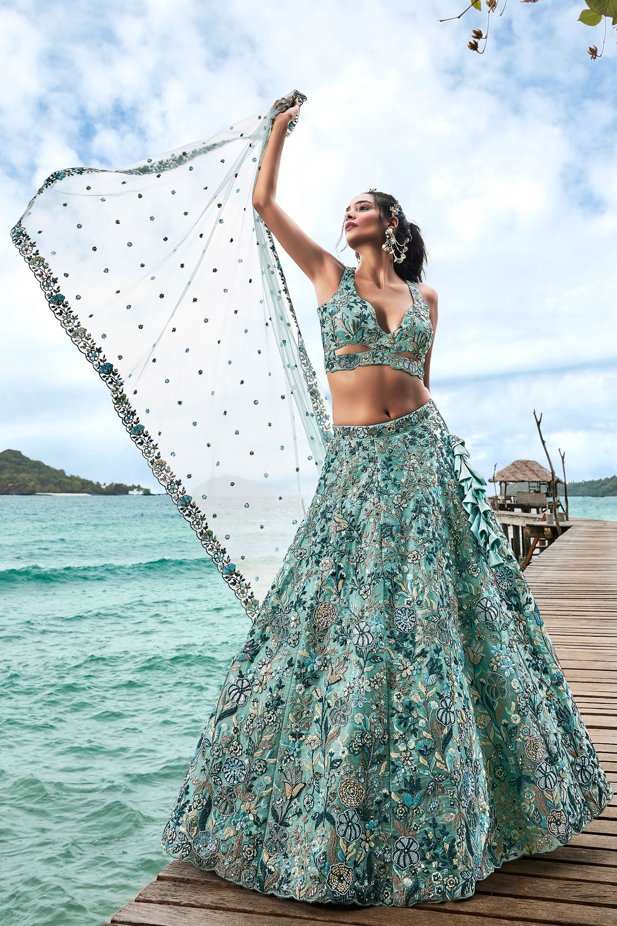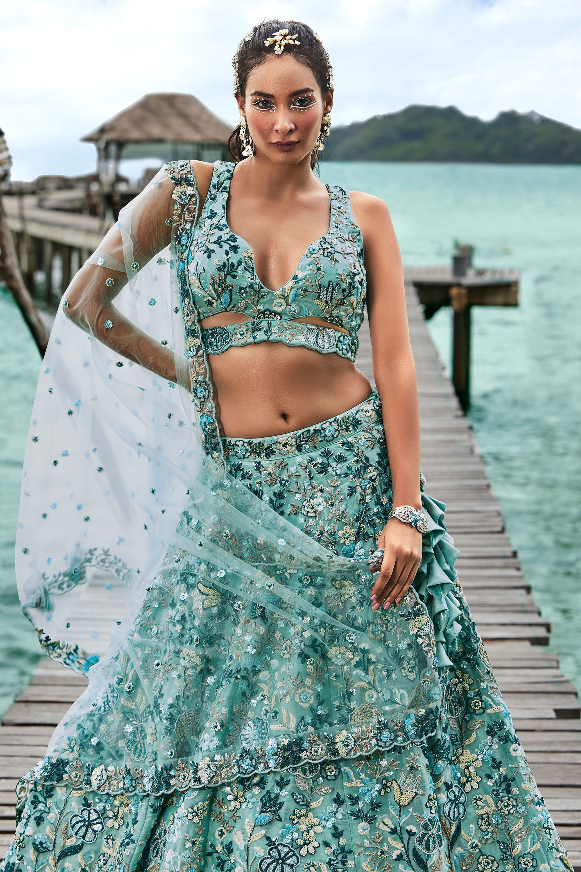 Sequins Work On Turquoise Blue Designer Lehenga In Organza Fabric With Beautiful Blouse