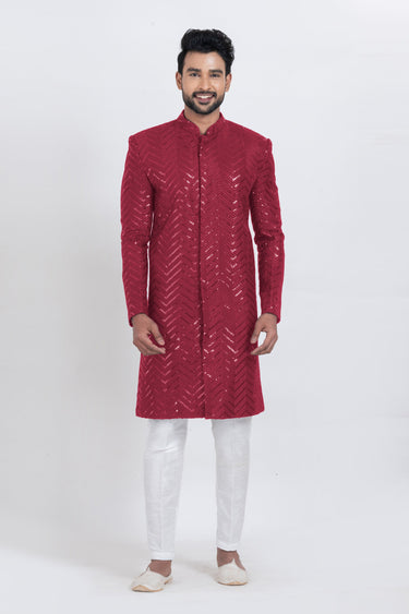 Sequins Work Red Viscose Graceful Readymade Men Indo Western For Festive Wear