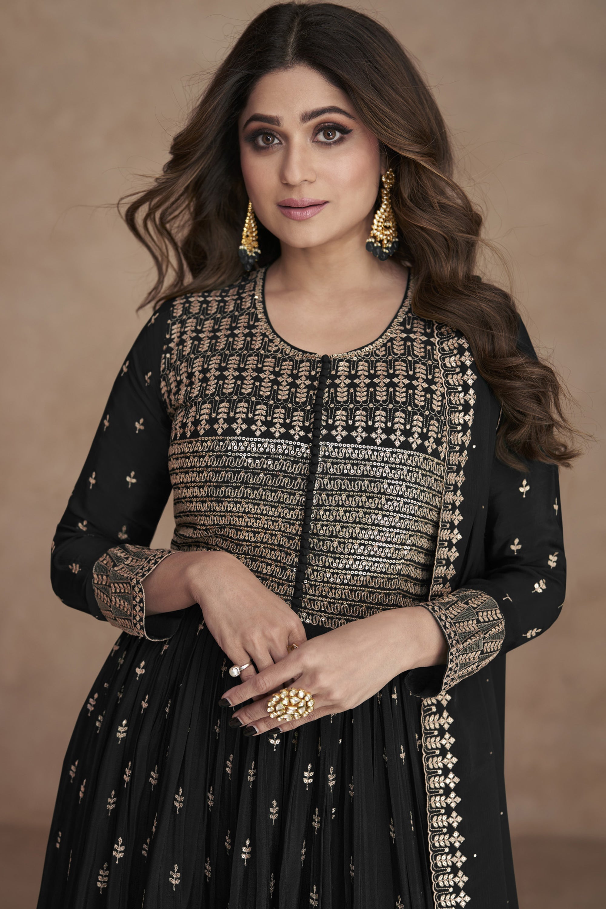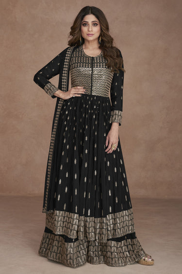 Shamita Shetty Featuring Embroidered Sangeet Wear Anarkali Salwar Kameez In Georgette Fabric Black Color
