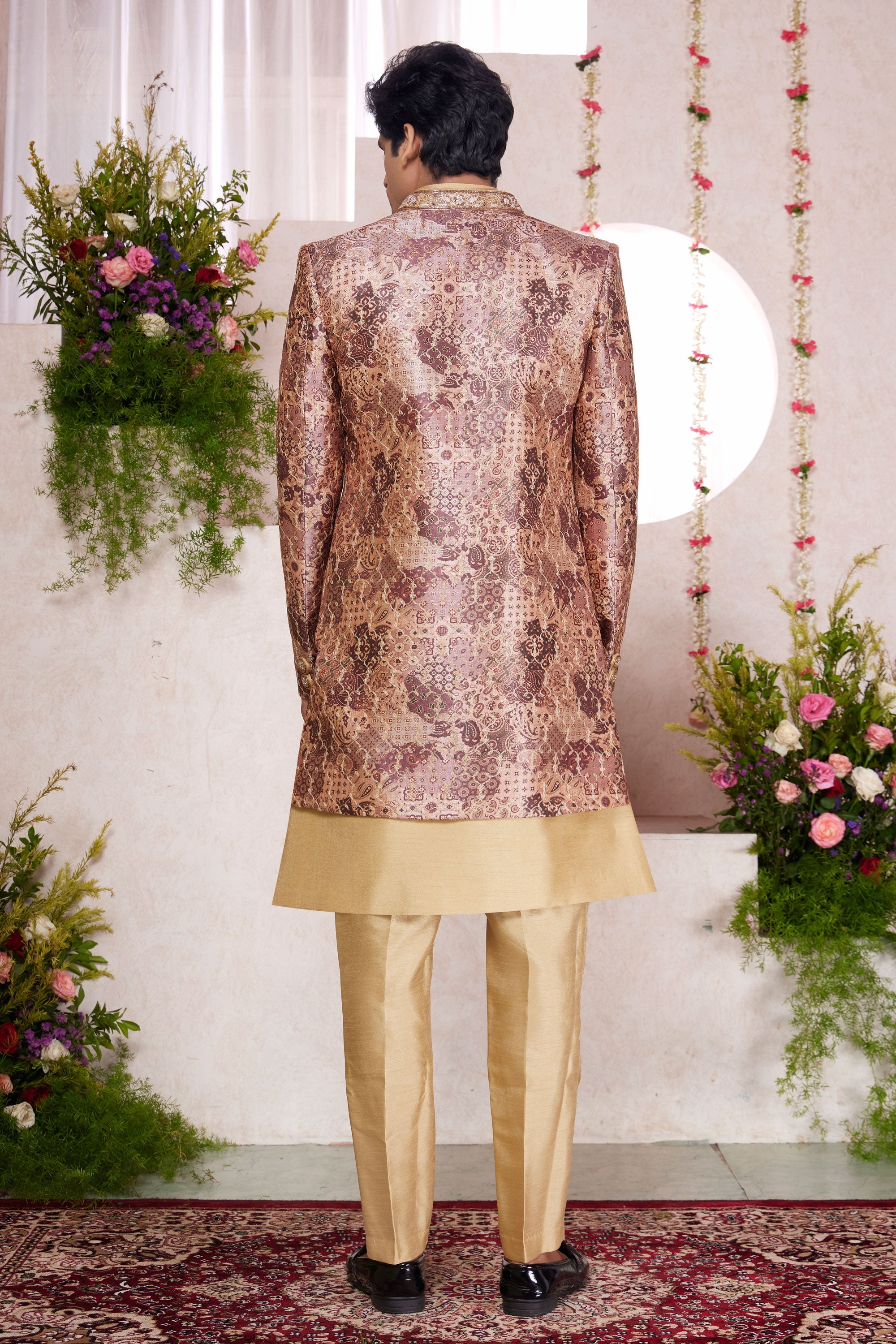 Transform your wedding look with the Reach Color Wedding Wear Readymade Glamorous Indo Western for Men in Jacquard Art Silk Fabric. Crafted with care, this attire merges traditional and modern elements for a striking appearance. The rich jacquard art silk fabric adds an opulent touch, ensuring you stand out on your special day. Designed for comfort and style, this Indo Western outfit is perfect for the modern groom seeking elegance and class. The vibrant colors and intricate patterns are sure to capture attention and admiration.