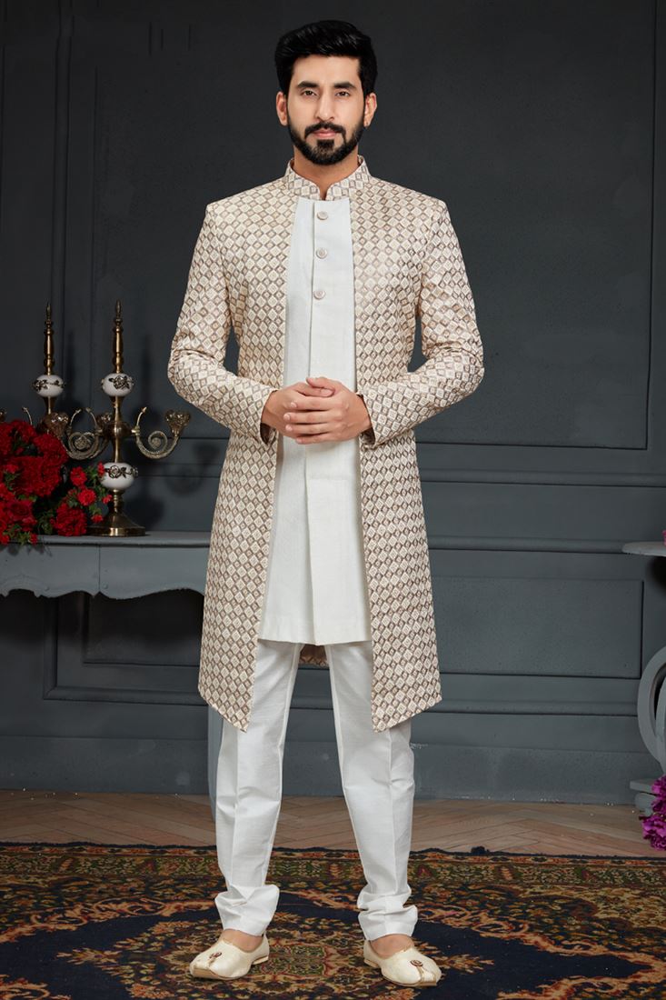 Silk Fabric Cream Color Wedding Wear Readymade Men Stylish Indo Western