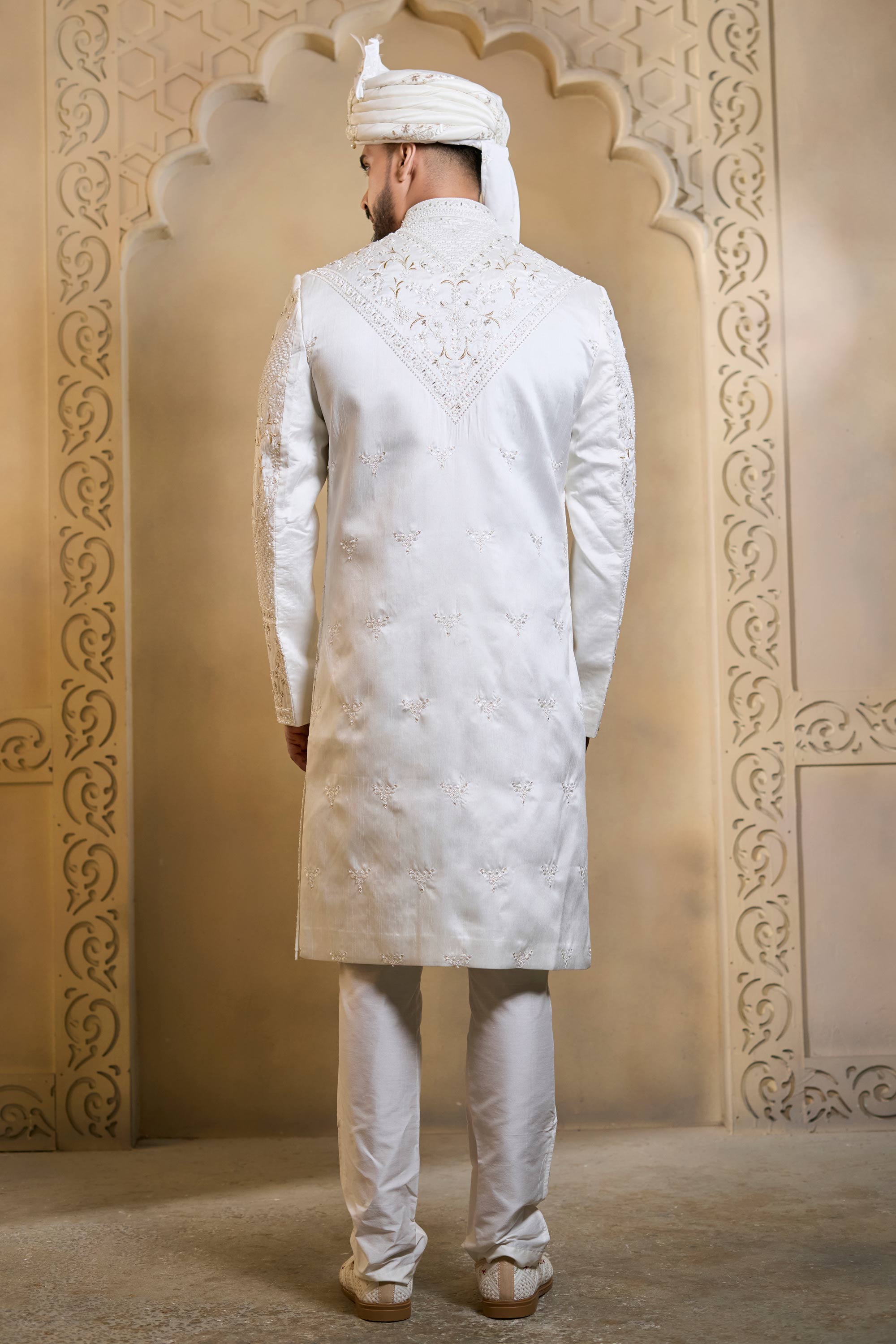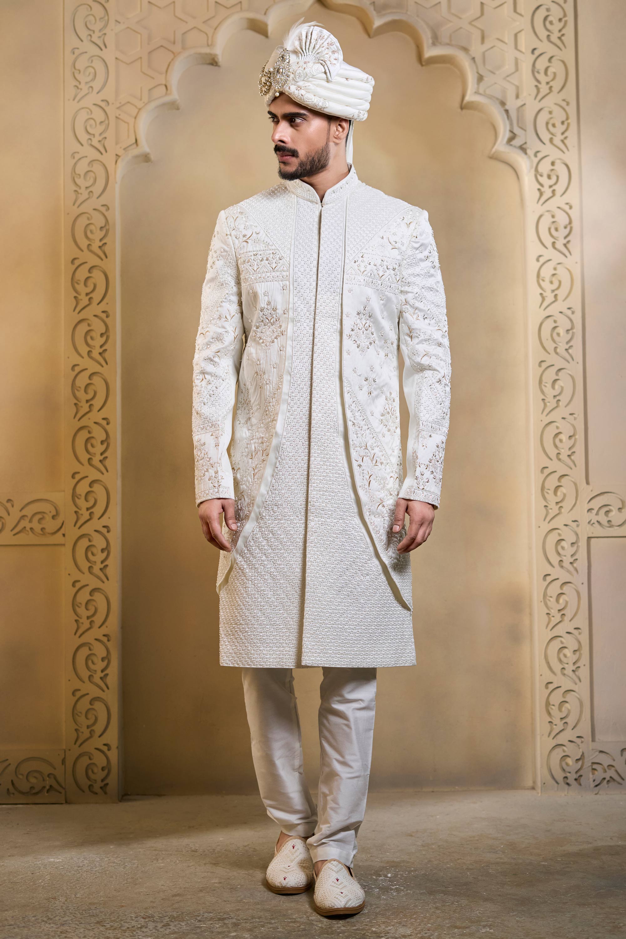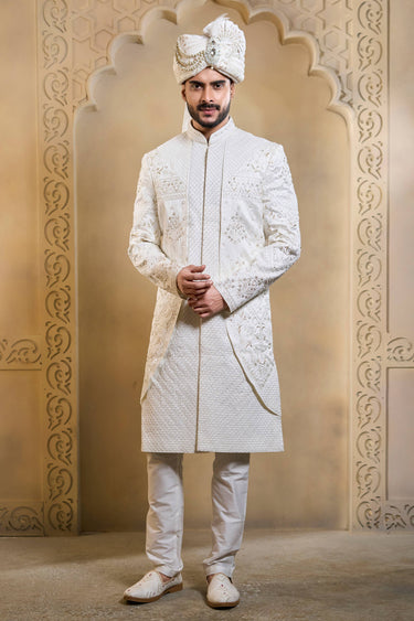 Silk Fabric Embroidered Work White Groom Sherwani For Men