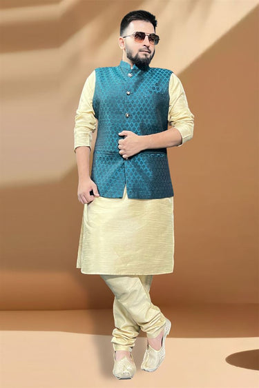 Silk Fabric Function Wear Cream Kurta Pyjama With Enriching Teal Color Jacket