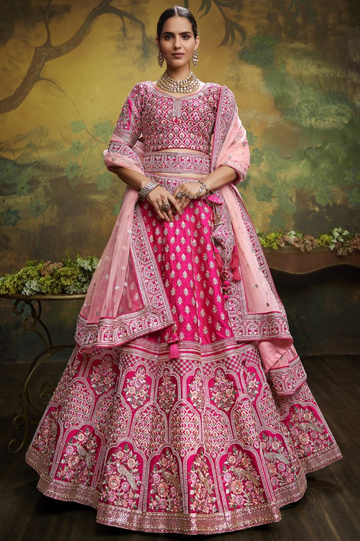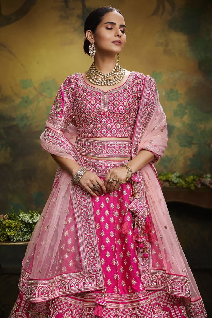 Silk Fabric Rani Color Bridal Lehenga Choli With Heavy Look Embroidered Work