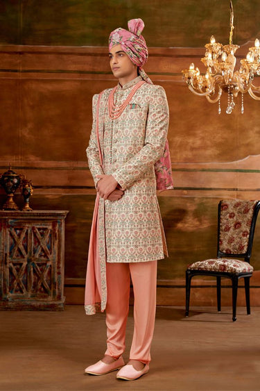 Silk Peach Color Wedding Wear Readymade Designer Men Heavy Embroidered Groom Sherwani With Stole