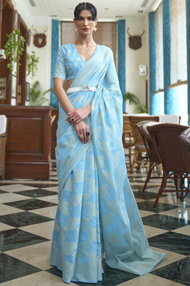 Sky Blue Color Cotton Fabric Party Wear Beautiful Saree With Fancy Work