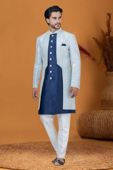 Sky Blue Color Jacquard Silk Fabric Jacquard Work Sangeet Wear Captivating Readymade Indo Western For Men