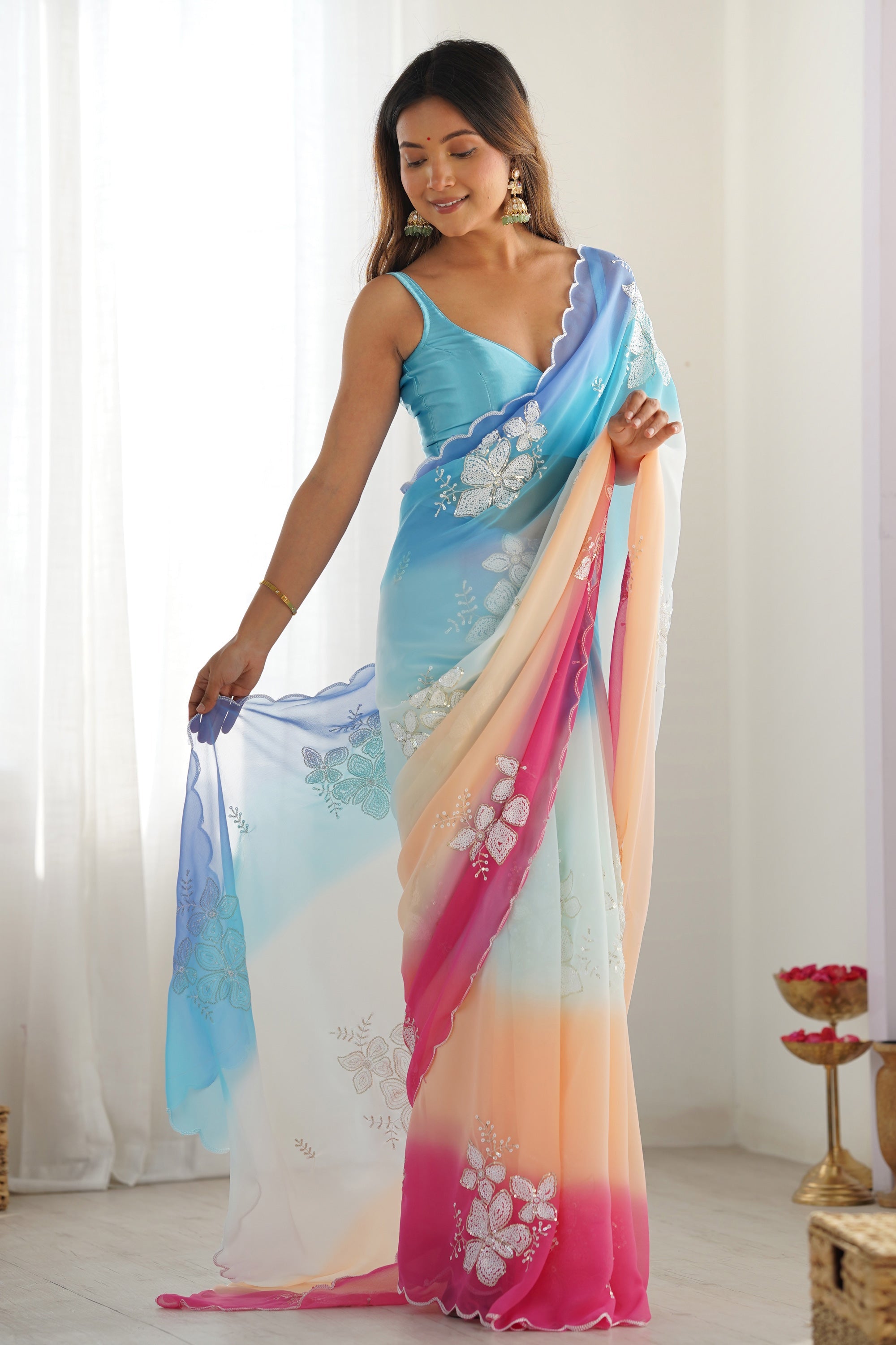 Sky Blue Sequins Work Georgette Casual Saree With Blouse