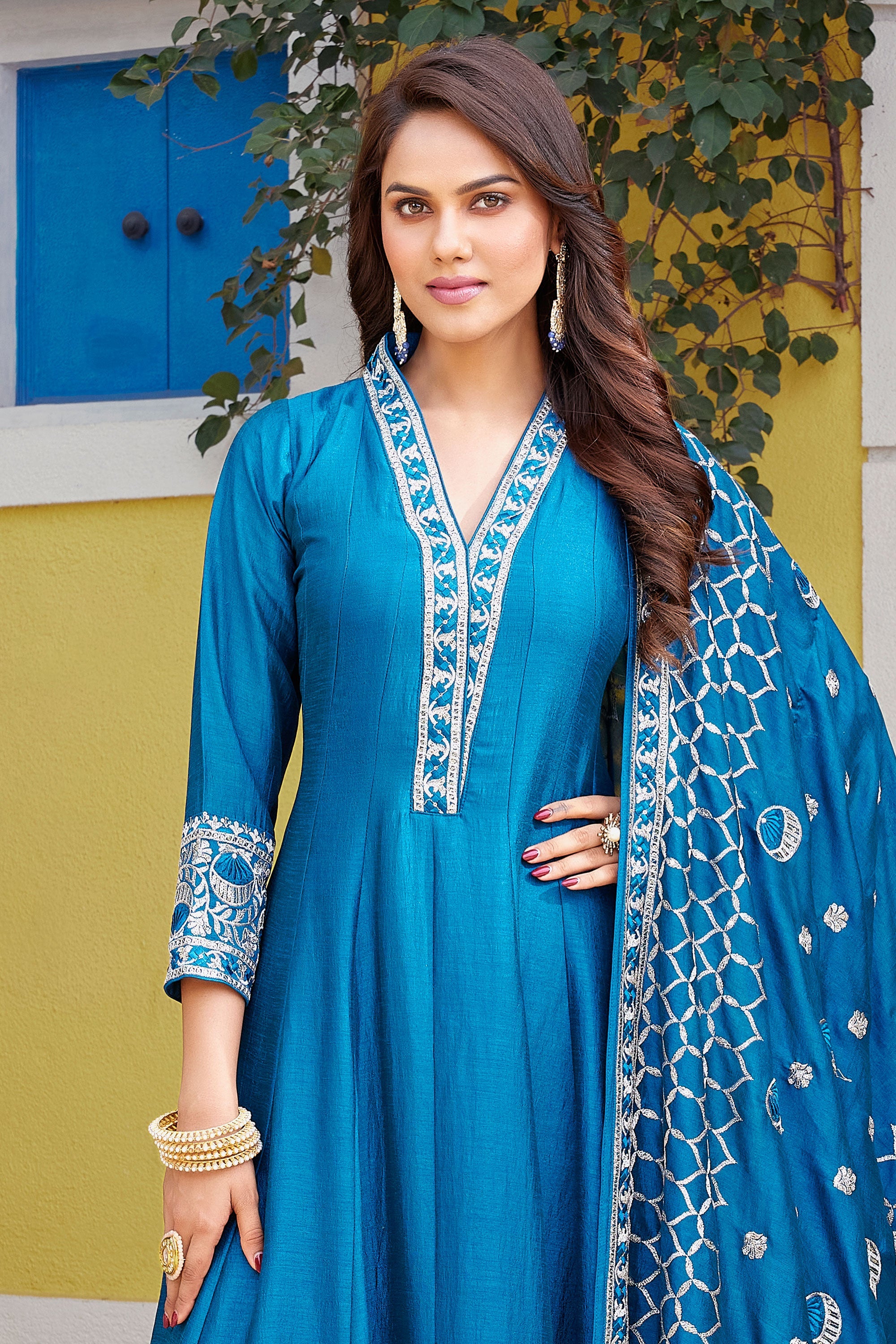 Sky Blue Silk Indo Western Front Cut And Pant And Dupatta