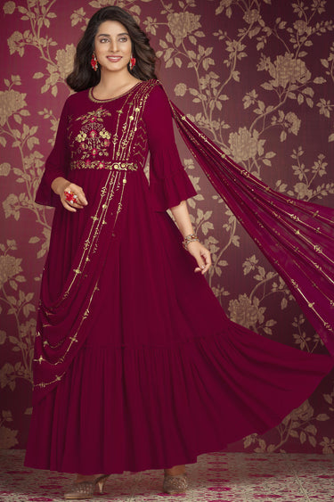 Soft Embroidered Maroon Color Readymade Party Style Gown
