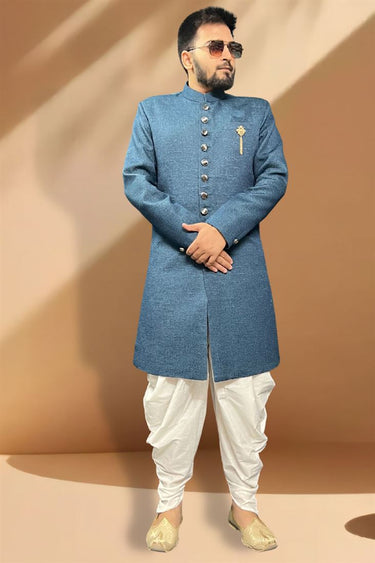 Splendiferous Blue Color Jacquard Fabric Peshawari Style Indo Western Set