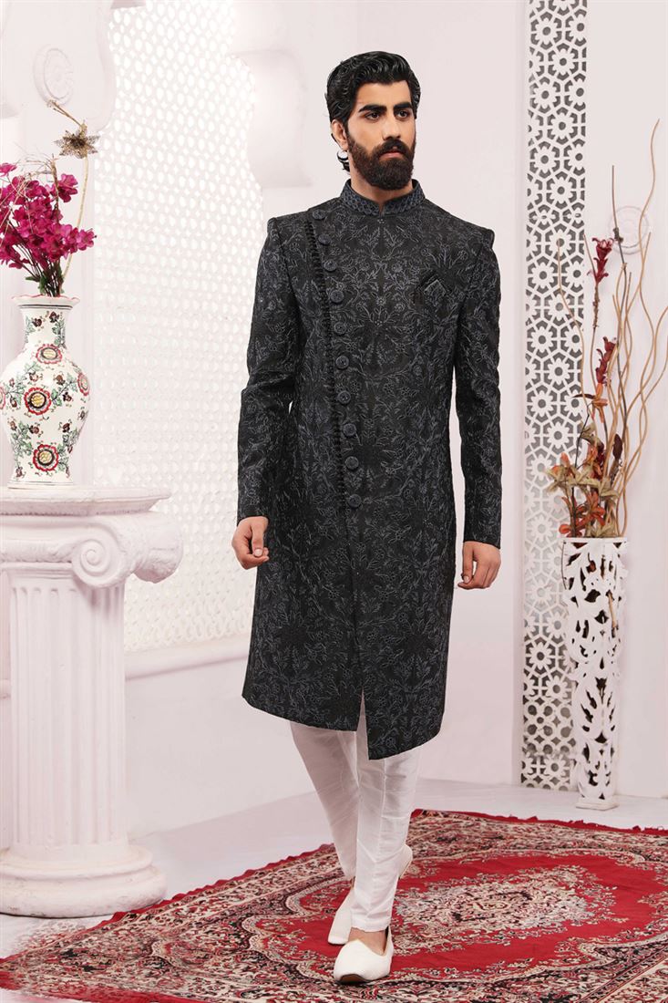 Striking Black Color Fancy Fabric Heavy Embroidered Designer Groom Sherwani