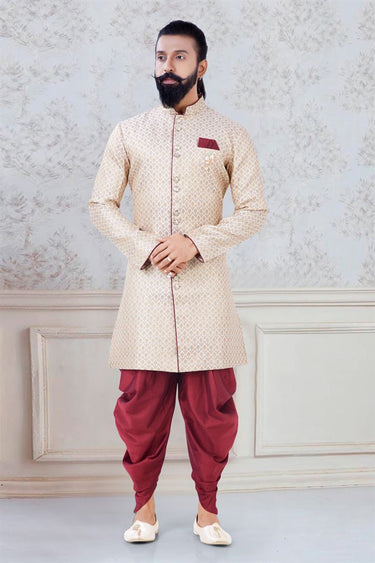 Striking Cream Color Brocade Fabric Festive Wear Stylish Readymade Dhoti Style Indo Western For Men