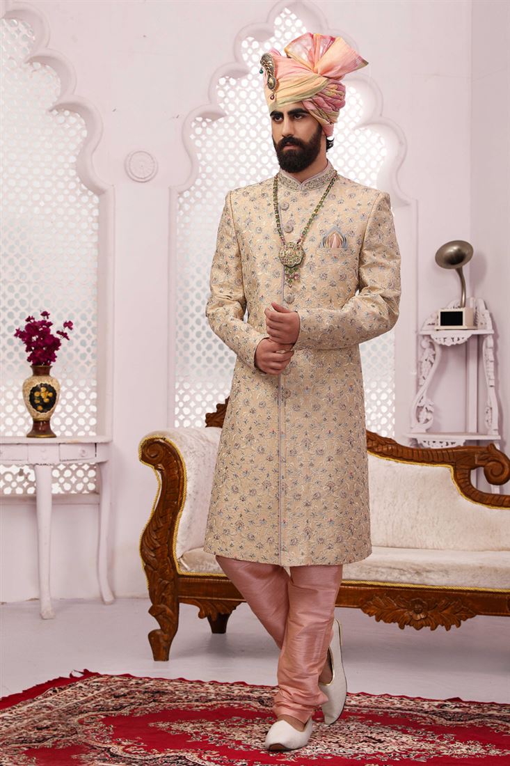 Stunning Cream Color Banarasi Silk Fabric Heavy Embroidered Designer Groom Sherwani