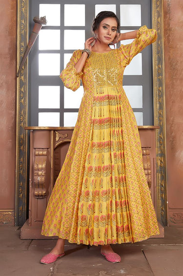 Stunning Yellow Muslin Readymade Lonh Kurti - Sizes 36-46 - Digital Printed