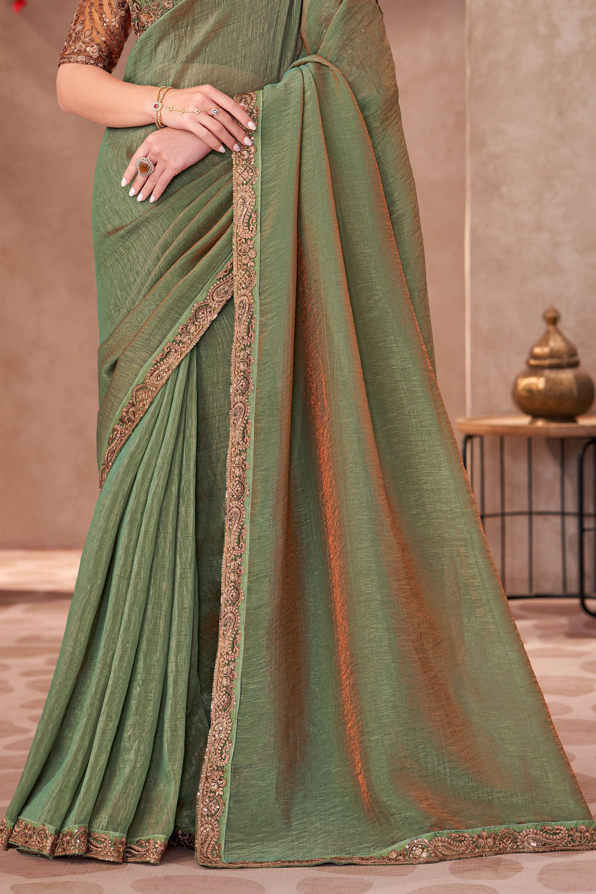 Drape yourself in sheer elegance with our Party Wear Golden Shine Georgette Saree, a perfect blend of sophistication and charm. Crafted from lightweight Georgette fabric, it flows gracefully to create a flattering silhouette, making it ideal for evening parties and special gatherings. The delicately detailed border work adds a refined touch of glamour, ensuring you stand out with understated luxury. Whether it’s a grand celebration or an intimate soirée, this saree offers both comfort and style for a memorable look. Please note: Due to digital photography, slight color variations may occur.