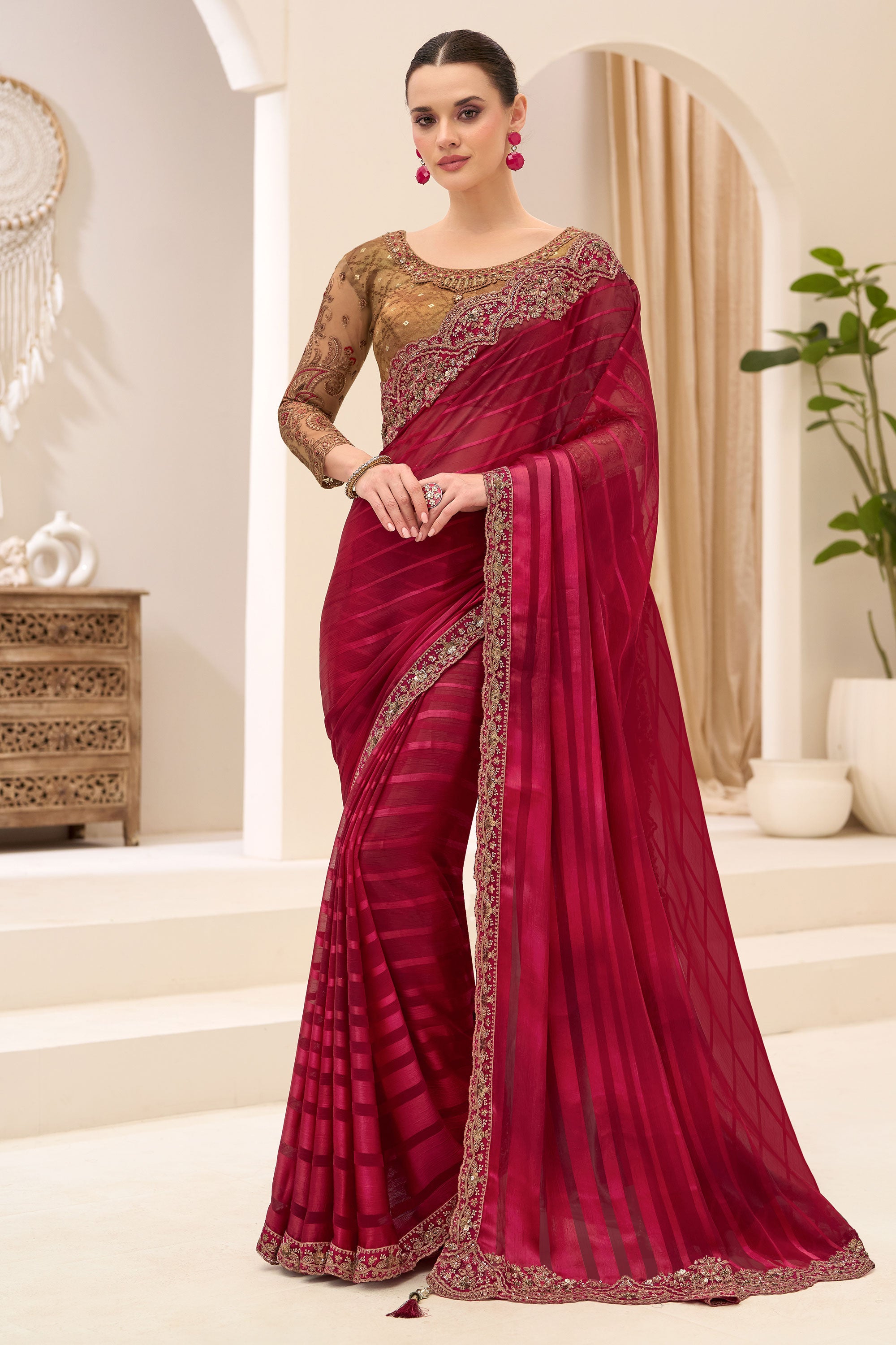 Stylish Rani Chiffon Satin Saree With Heavy Border Work