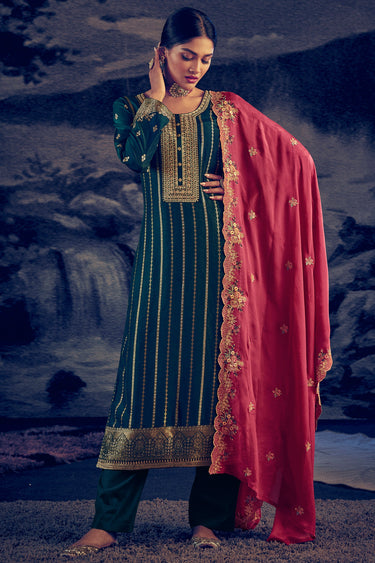 Teal Art Silk Embroidery Function Wear Palazzo Salwar Suit