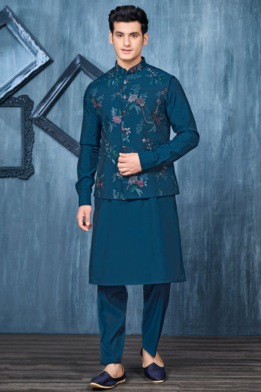 Teal Banarasi Silk Fabric Sangeet Wear Trendy Readymade Kurta Pyjama For Men With Jacket Set