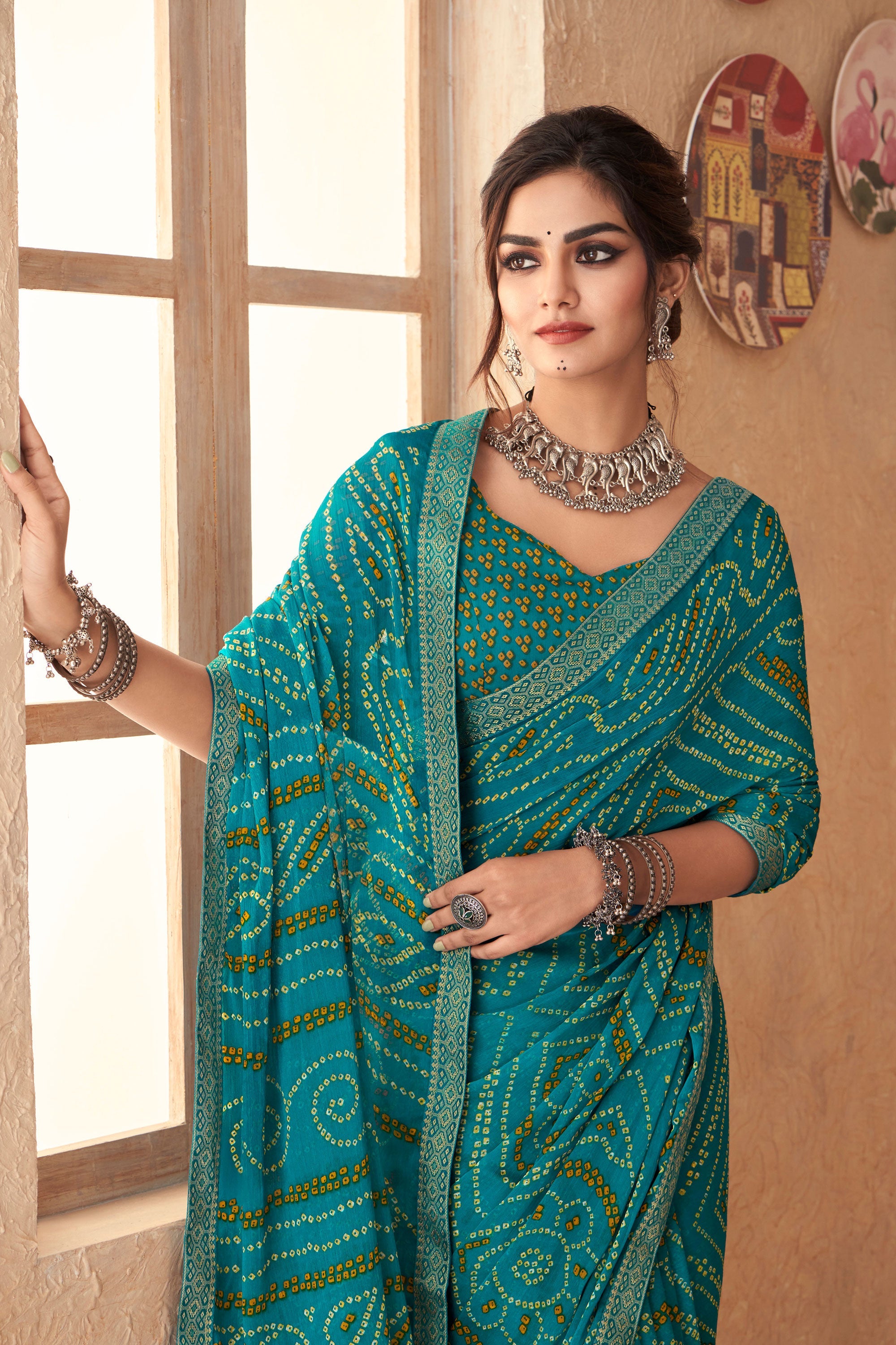 Teal Bandhani Print Attached Banarasi Border Daily Wear Saree