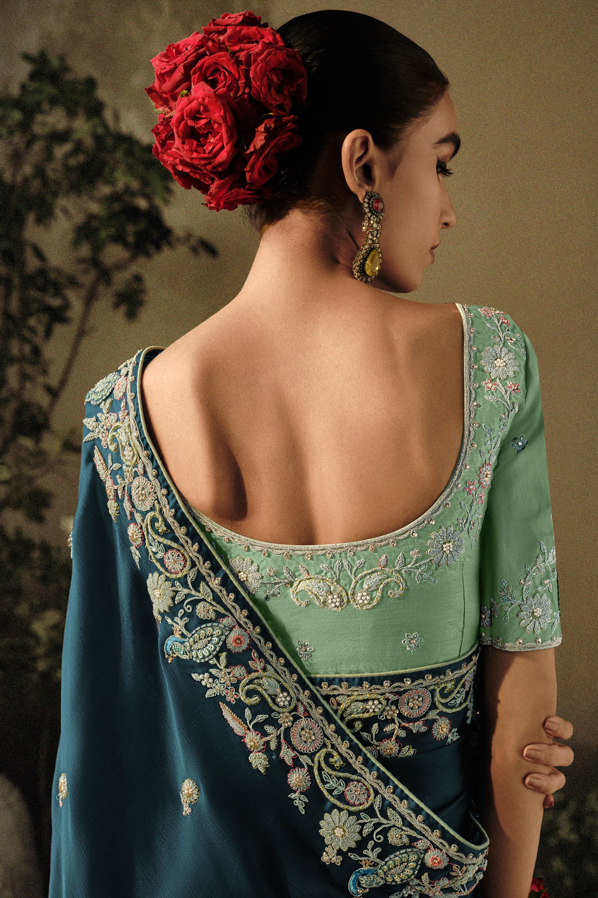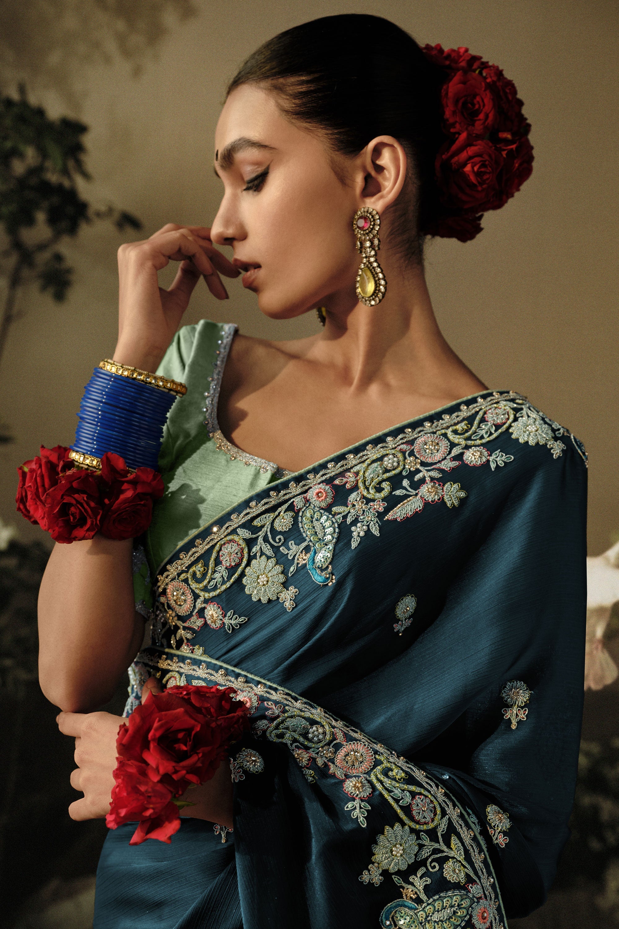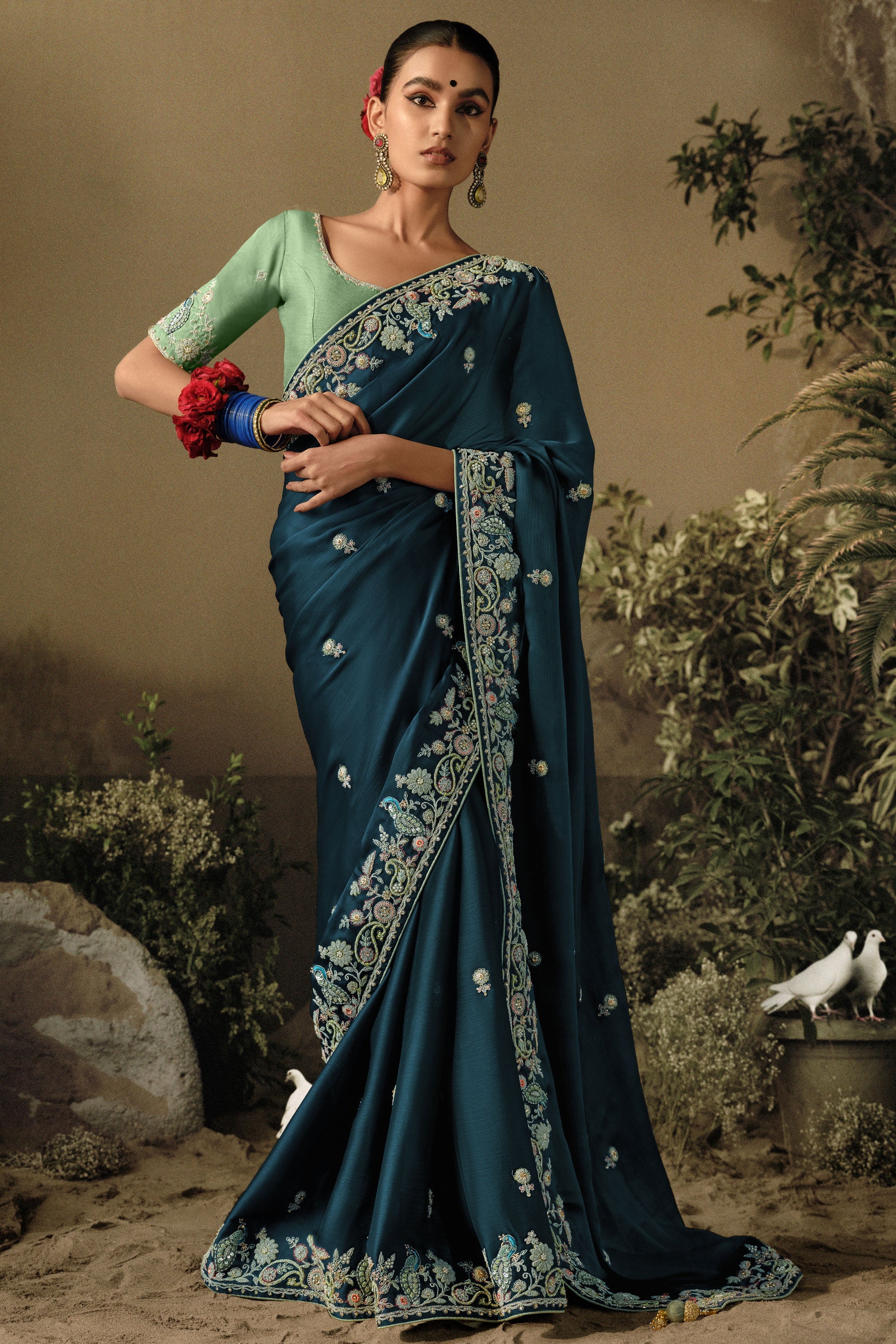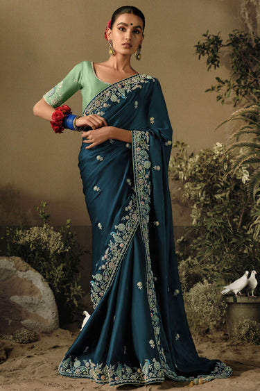 Teal Color Art Silk Fabric Embroidered Border Work Saree With Designer Blouse