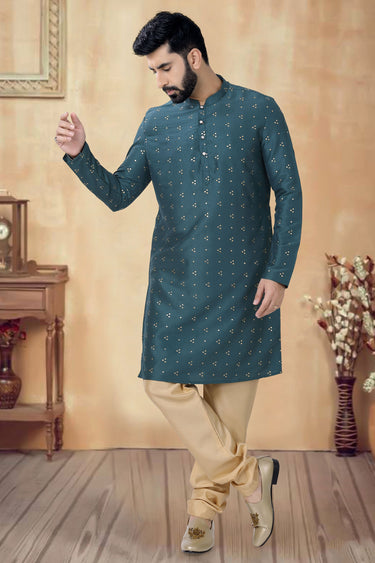 Teal Color Reception Wear Readymade Silk Fabric Kurta Pyjama For Men