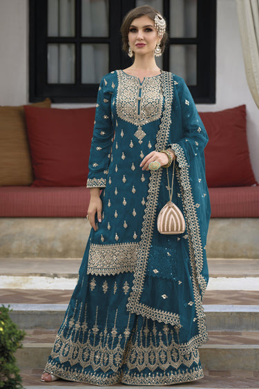 Teal Color Silk Fabric Fancy Embroidered Function Wear Readymade Designer Sharara Style Salwar Suit