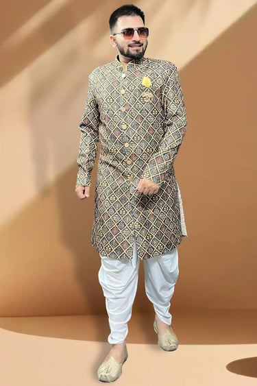 Teal Cotton Fabric Graceful Readymade Men Peshawari Style Indo Western For Wedding Wear