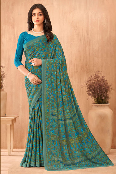 Teal Printed Crepe Silk Uniform Saree