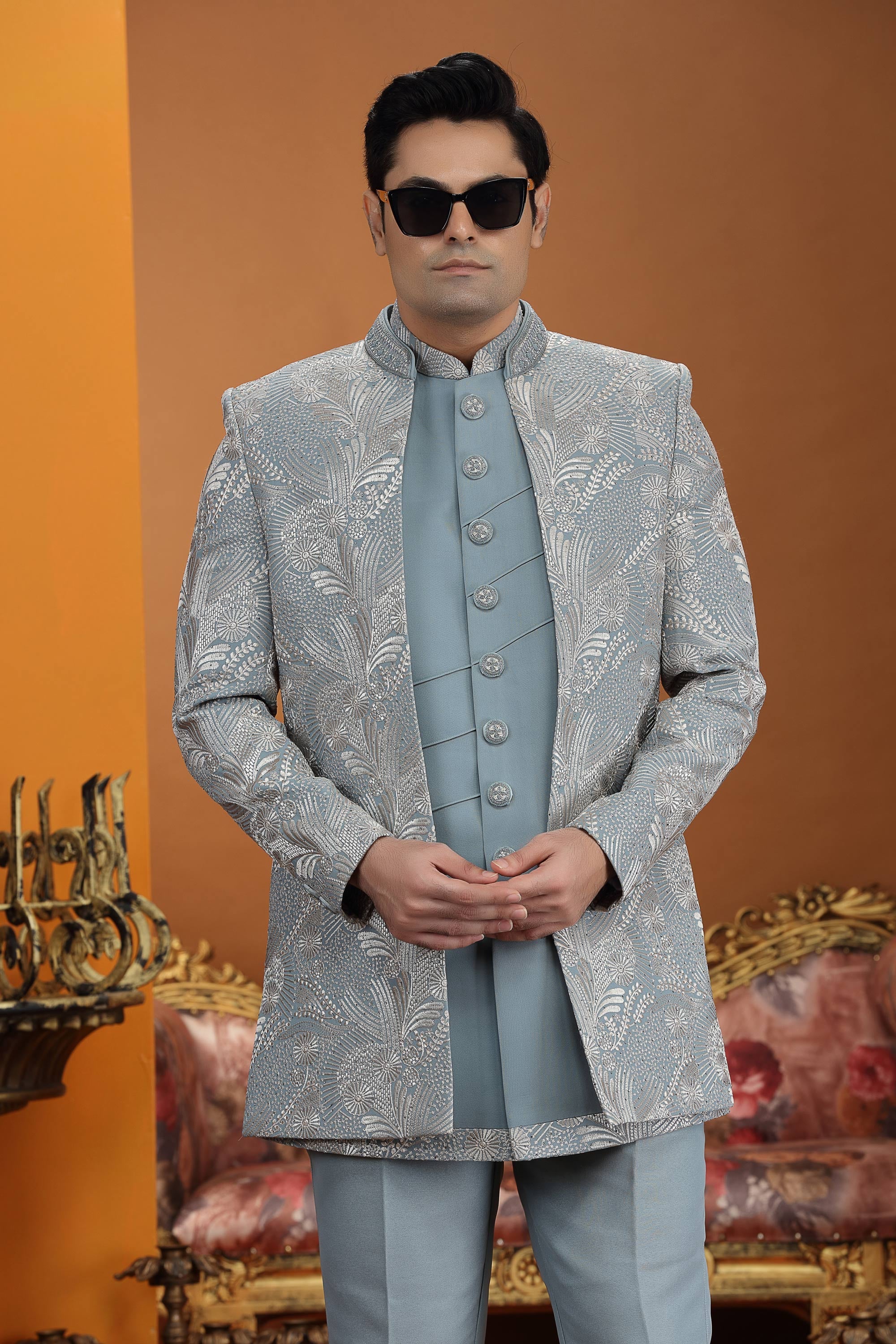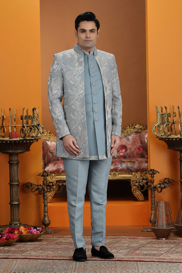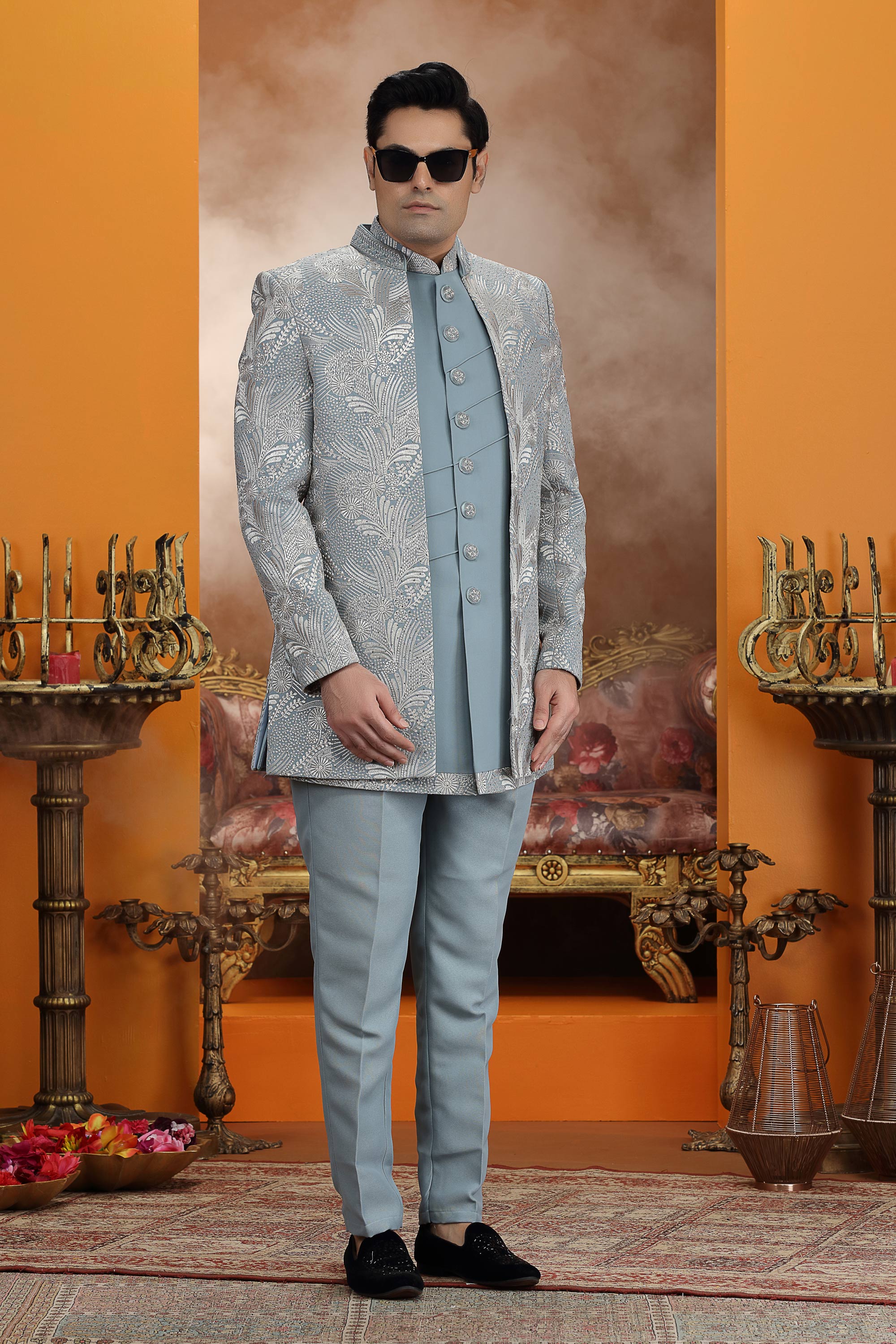 Elevate your wedding style with this regal Men Indo Western, designed to give a classy and sophisticated appearance. The top is made from premium art silk featuring computer thread embroidery work, adding richness and fine detailing. The 3-piece jacket set enhances the royal look, making it ideal for wedding celebrations. Due to digital photography, slight color variations may occur.