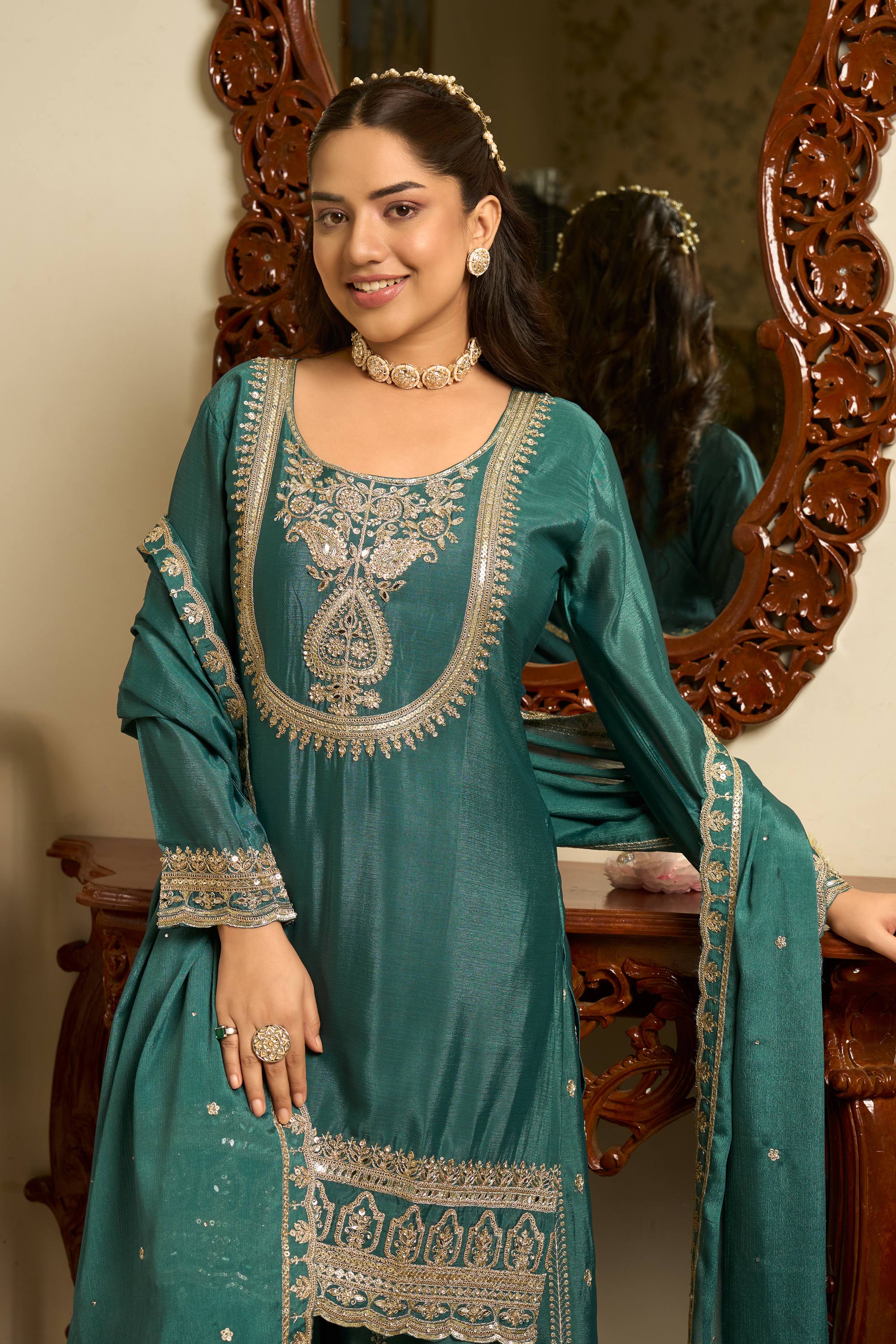 Teal Wedding Wear Chinon Silk Embroidered Readymade Palazzo Suit