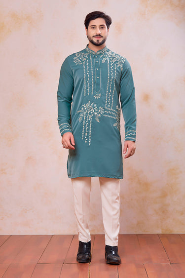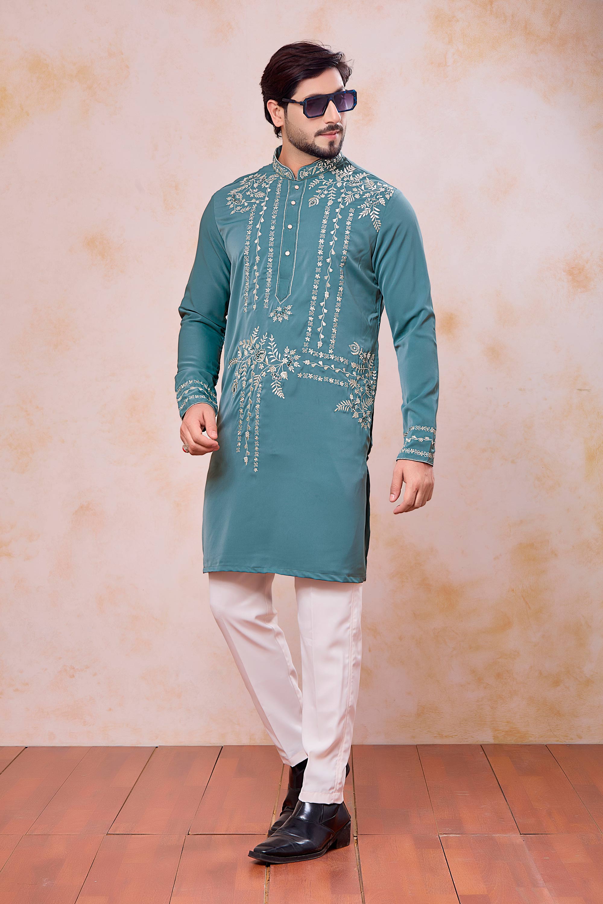Teal Wedding Wear Fancy Fabric Embroidered Readymade Kurta With Aligadhi Pant For Men