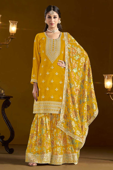 Tempting Chinon Fabric Yellow Function Wear Sharara Suit