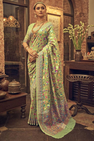 Tempting Printed Work On Kashmiri Silk Fabric Sea Green Color Saree