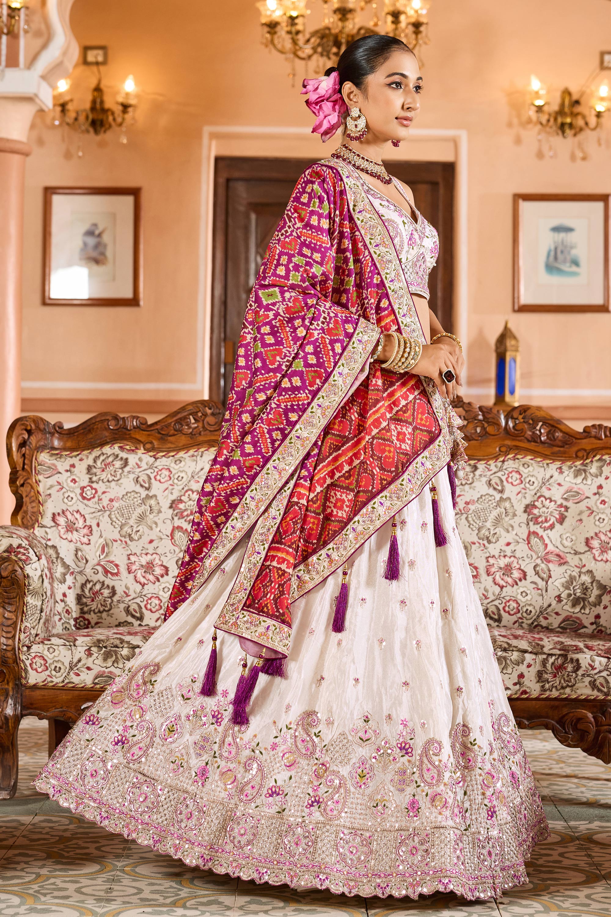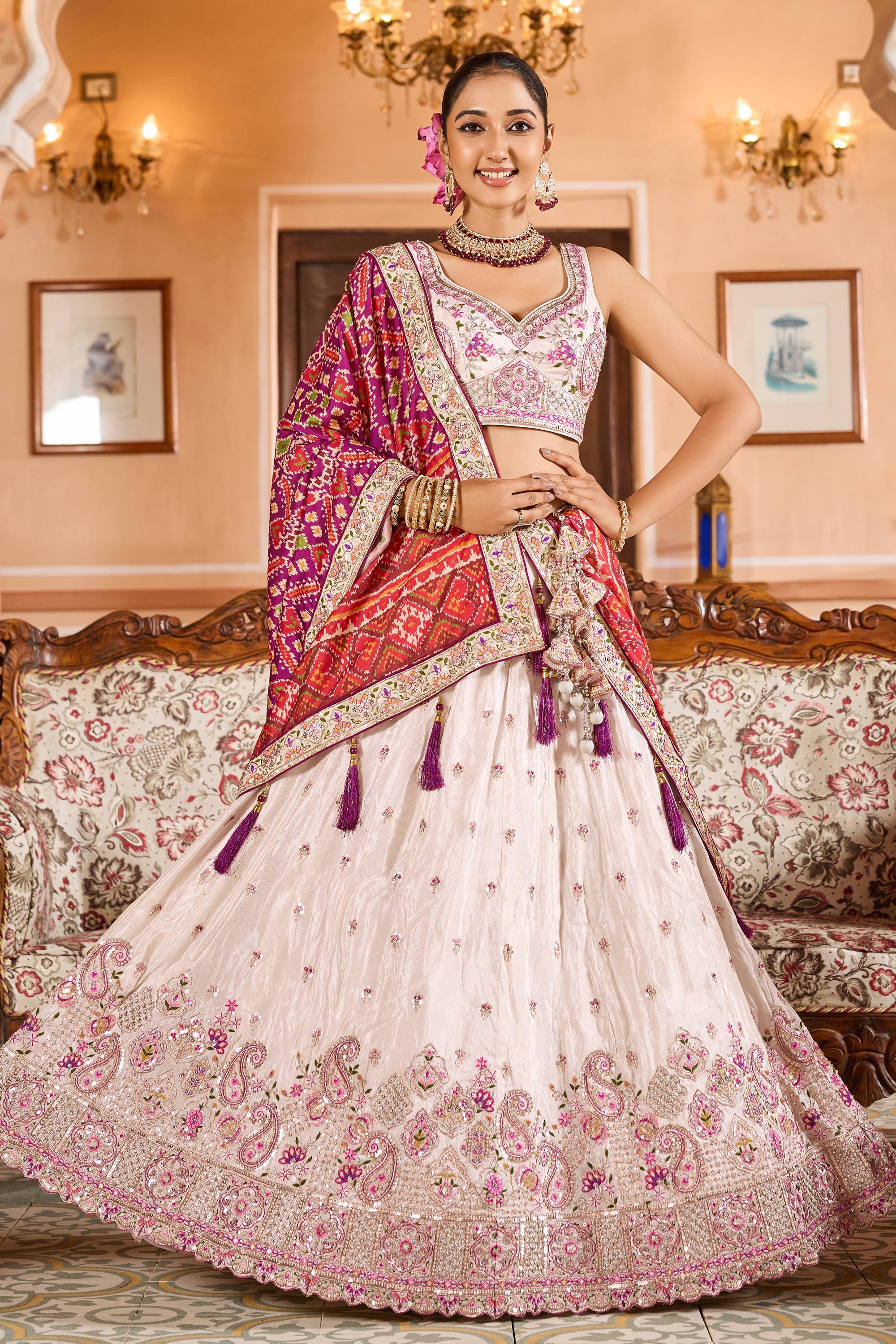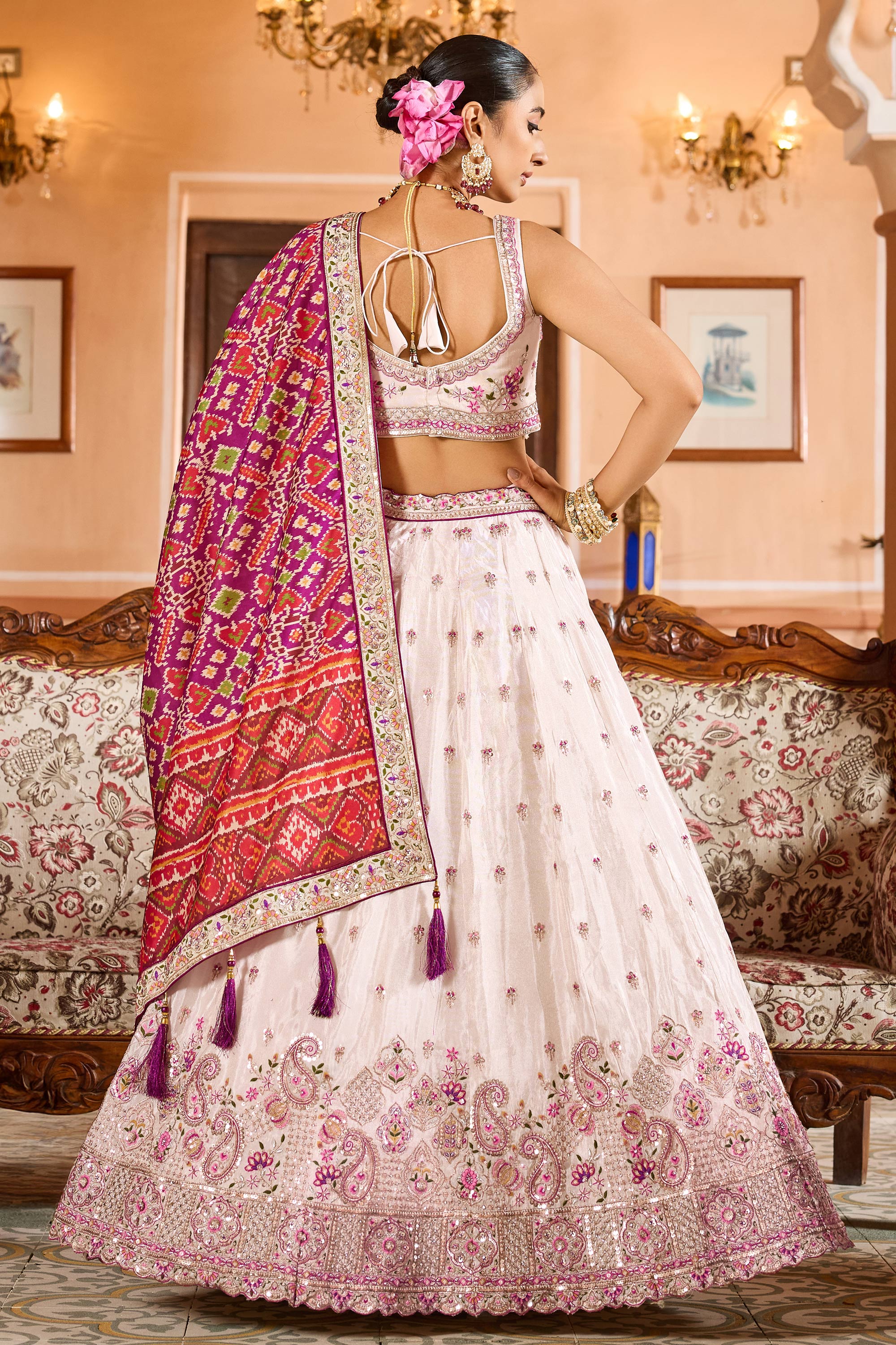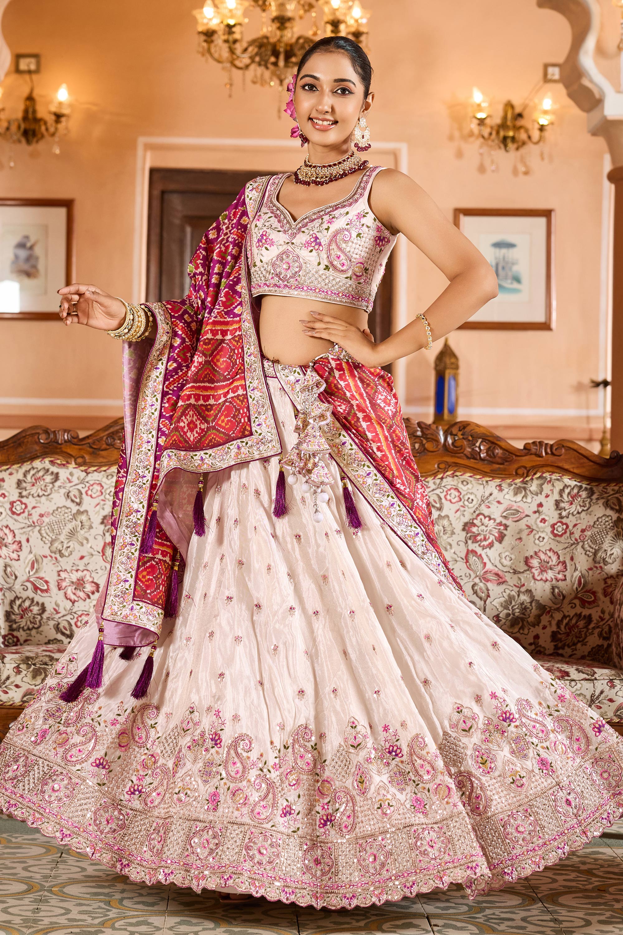 Tissue Embroidered Beige Wedding Wear Lehenga Choli With Dupatta