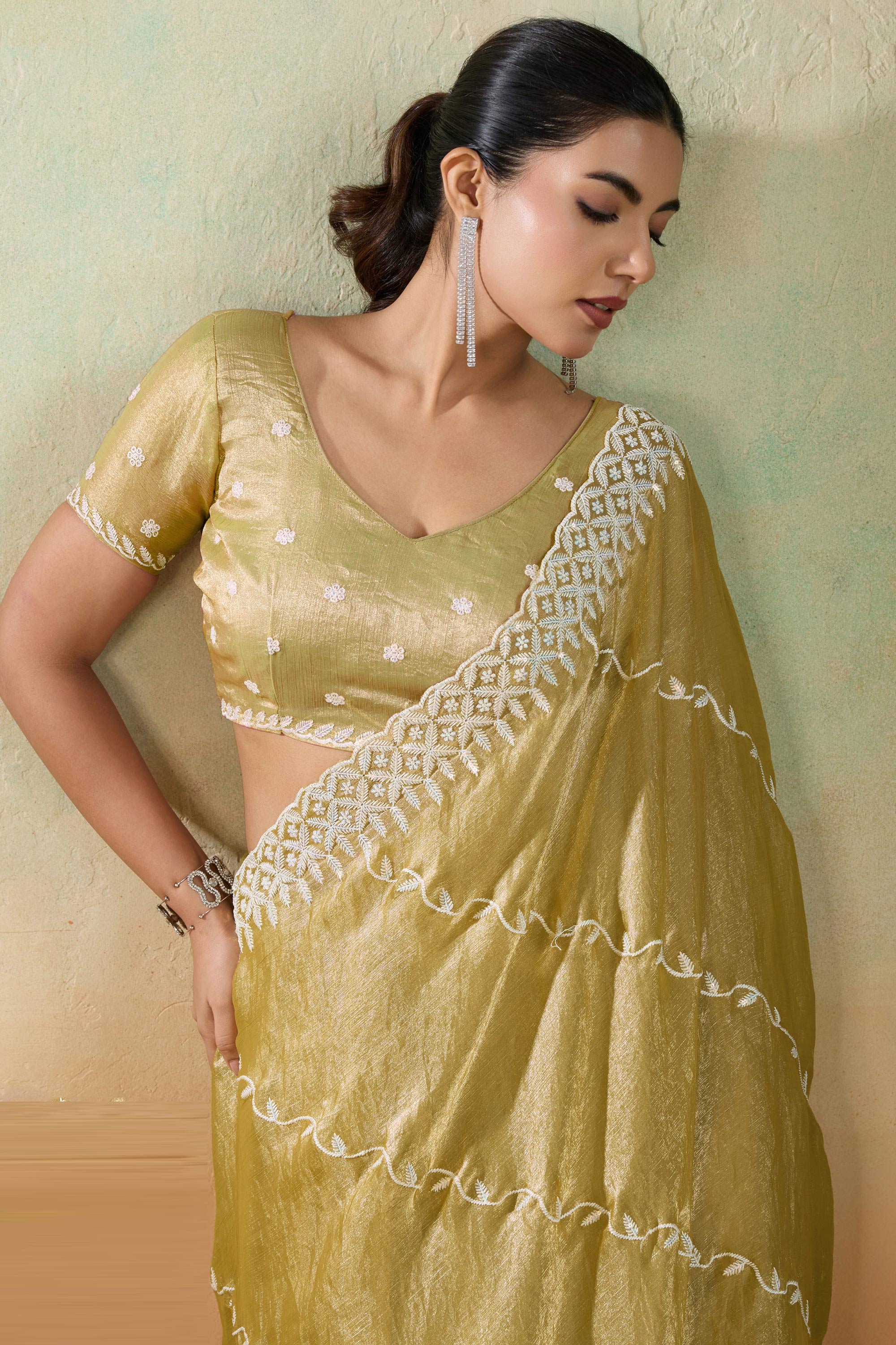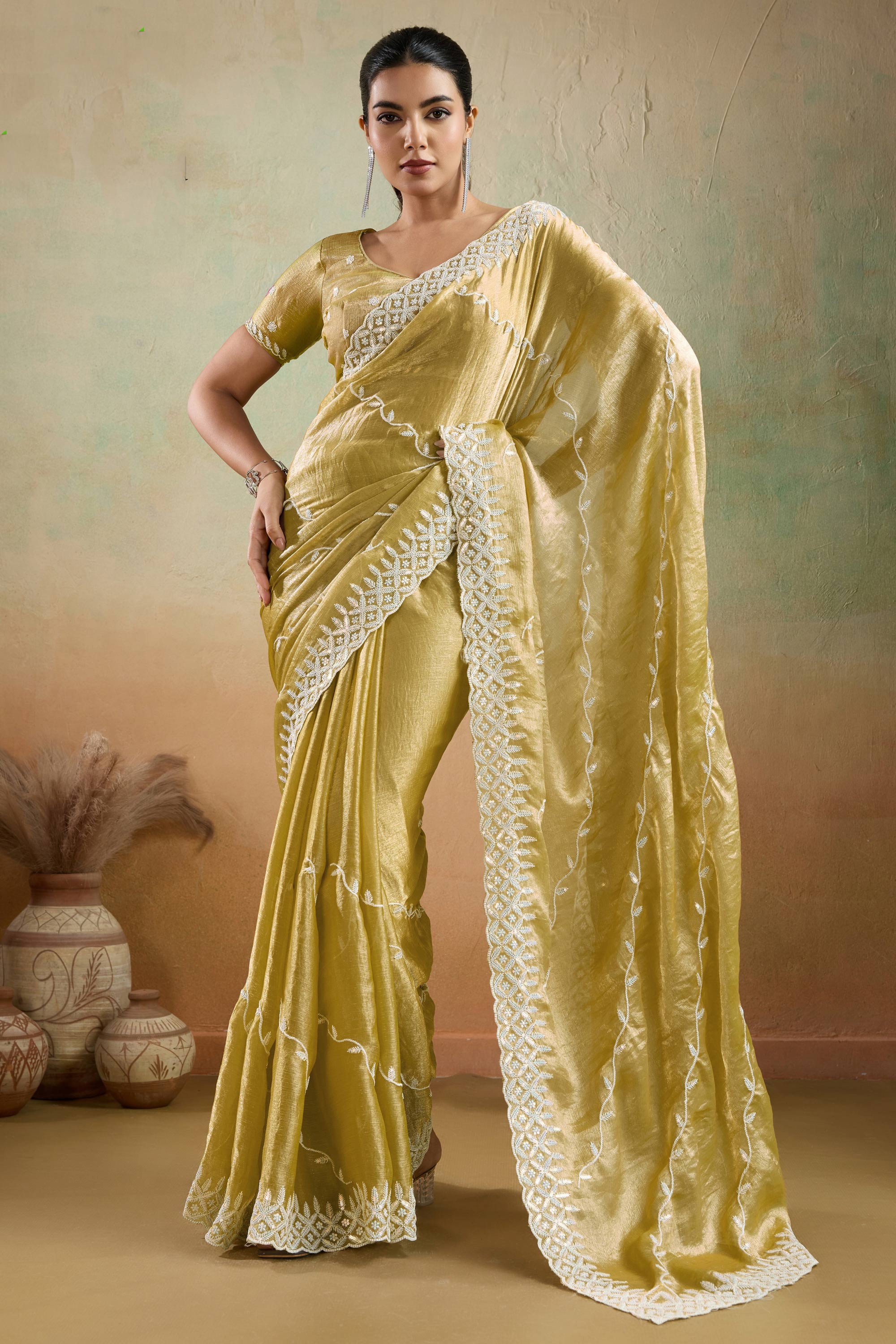 Tissue Fabric Thread Sequins Work Saree In Yellow Color